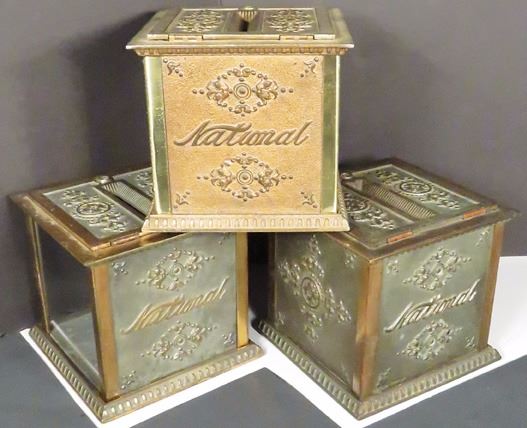 Three National Cash Register Co. Money Boxes. Brass and copper plated with two glass windows. 6 5/8 X 6 X 6 5/8 inches.