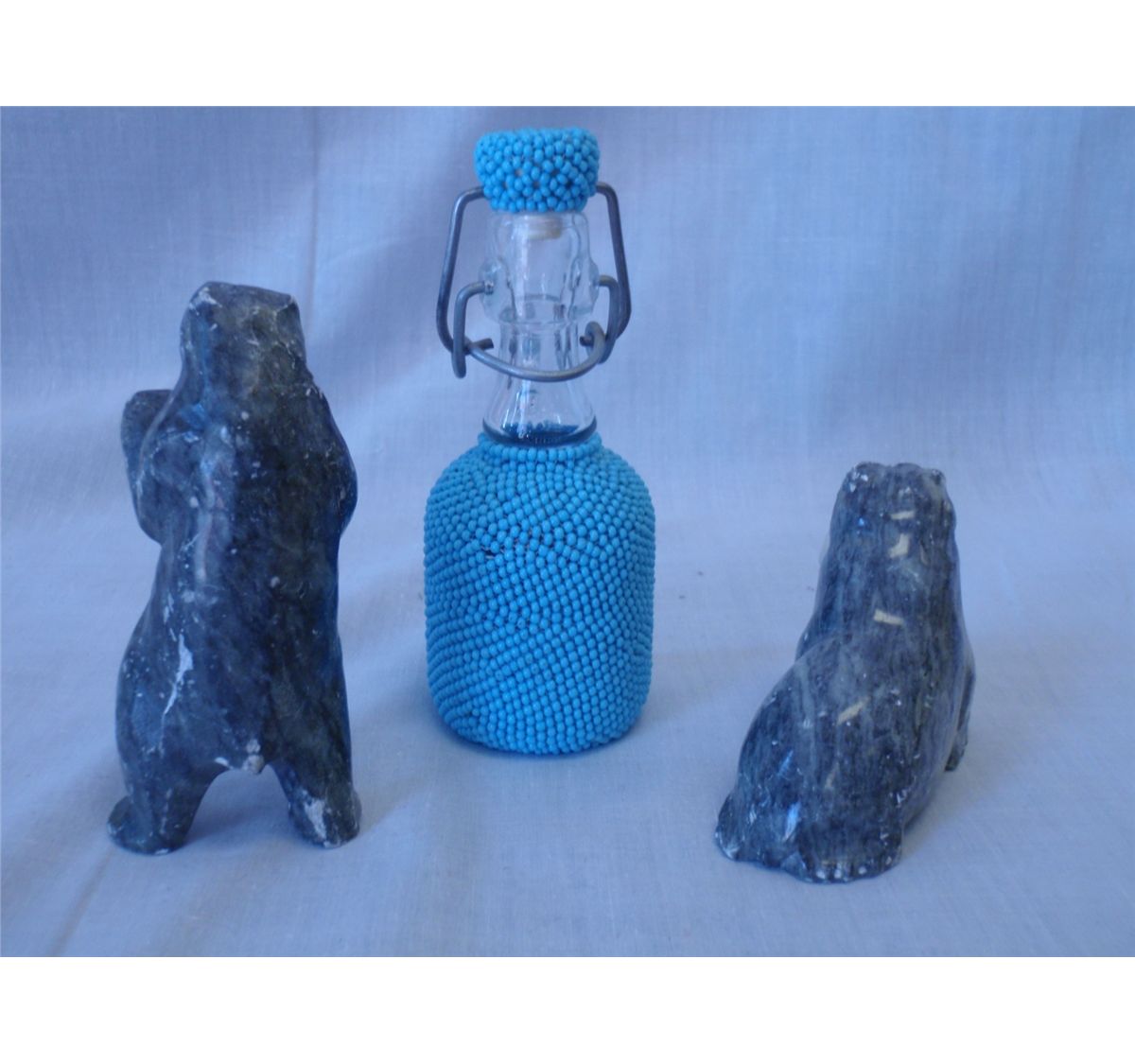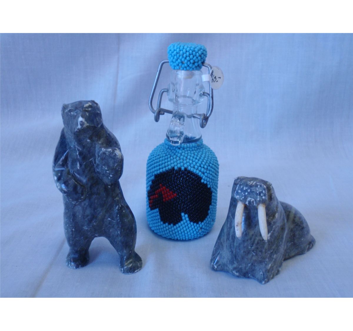 Two, signed Eskimo, soap stone carvings. One miniature, beaded bottle with bear design. Bear measures 4"Tall, Walrus measures 2" Tall, Bottle measures 4 3/4" Tall Shipping on this lot: $10.00. Additional Shipping Charges for Lots sent outside of the U.S