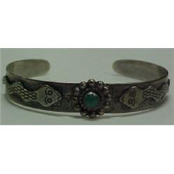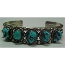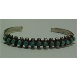 Three Native American sterling silver and turquoise cuff bracelets, one approximately 1/4" wide set with fourteen small round turquoise stones, one approximately 1/2" wide set with one small turquoise, applied snake design, marked inside silver arrow sterling and one approximately 1/2" wide set with five nugget type turquoise stones Estimate 60/90