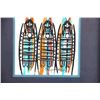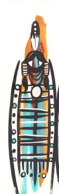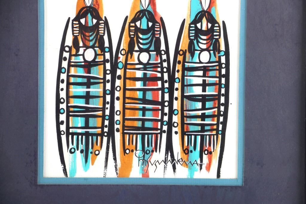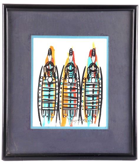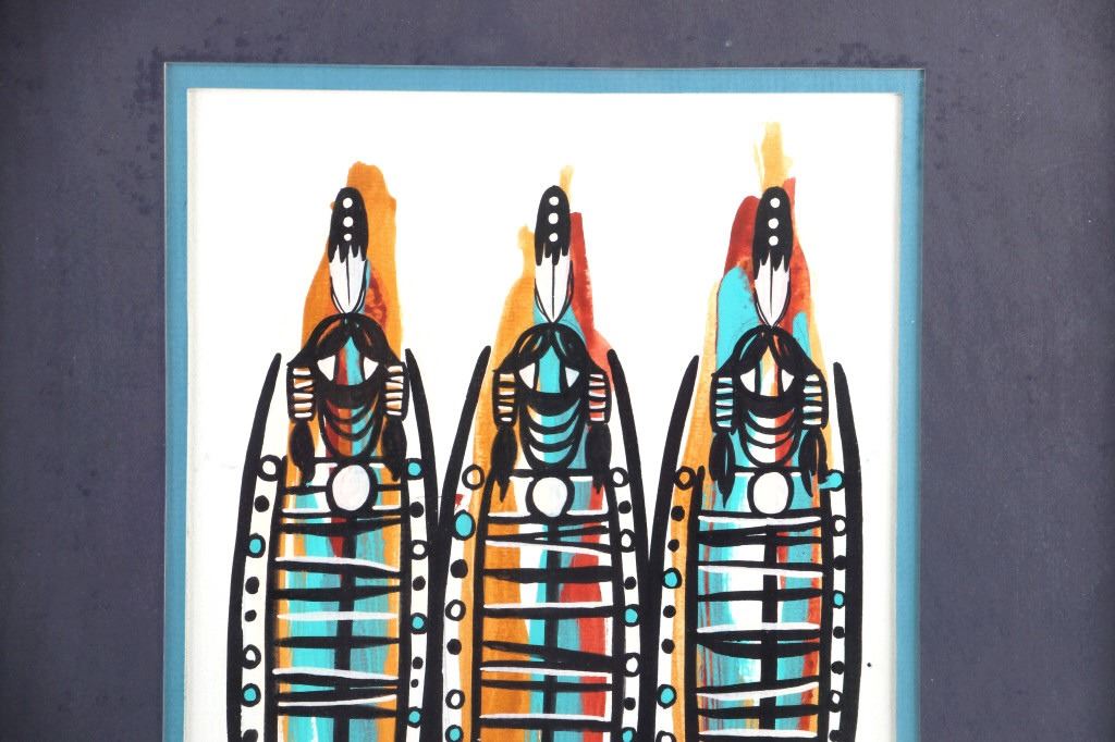 Featured in this lot is this framed watercolor of three Native spirit figures. The artwork shows wonderfully and professionally crafted water color with beautiful colors and hard black lines that outline three Native spirit figures and shows the artist signature in the bottom right hand corner. The condition of this watercolor painting is good with no obvious signs of damage to the artwork or the frame and in good overall condition. The measurements of this painting are 17" x 15" and the visible art measures 9 3/4" x 8 1/8".