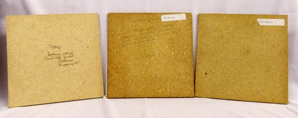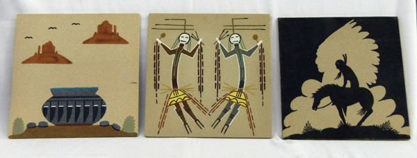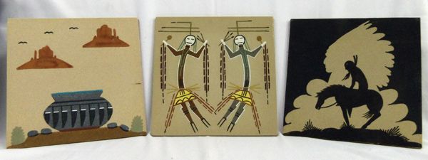 Three Native American Navajo Sand Paintings. 1) Black on tan has id # CHIP121202 on the back ''End of the Trail'' theme. 2) Represents ''Spirit of the earth...'' by artist Cecil Yazzie explained on the back. 3) ''Pottery'' with natural ground sand by Watchman of Sheepsprings, NM. All are 12'' square.