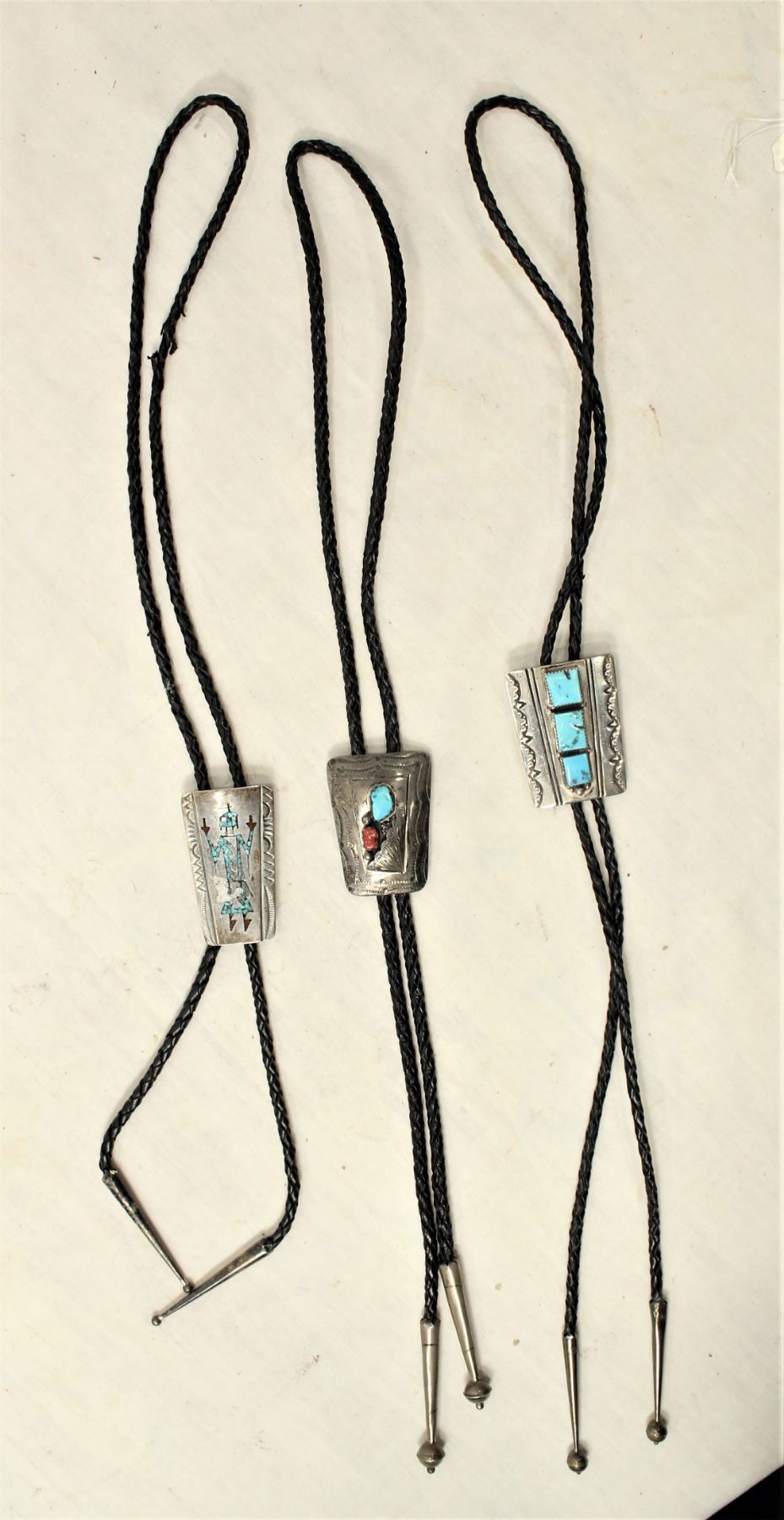 Three fashionable sterling silver bolo ties with turquoise mountings.