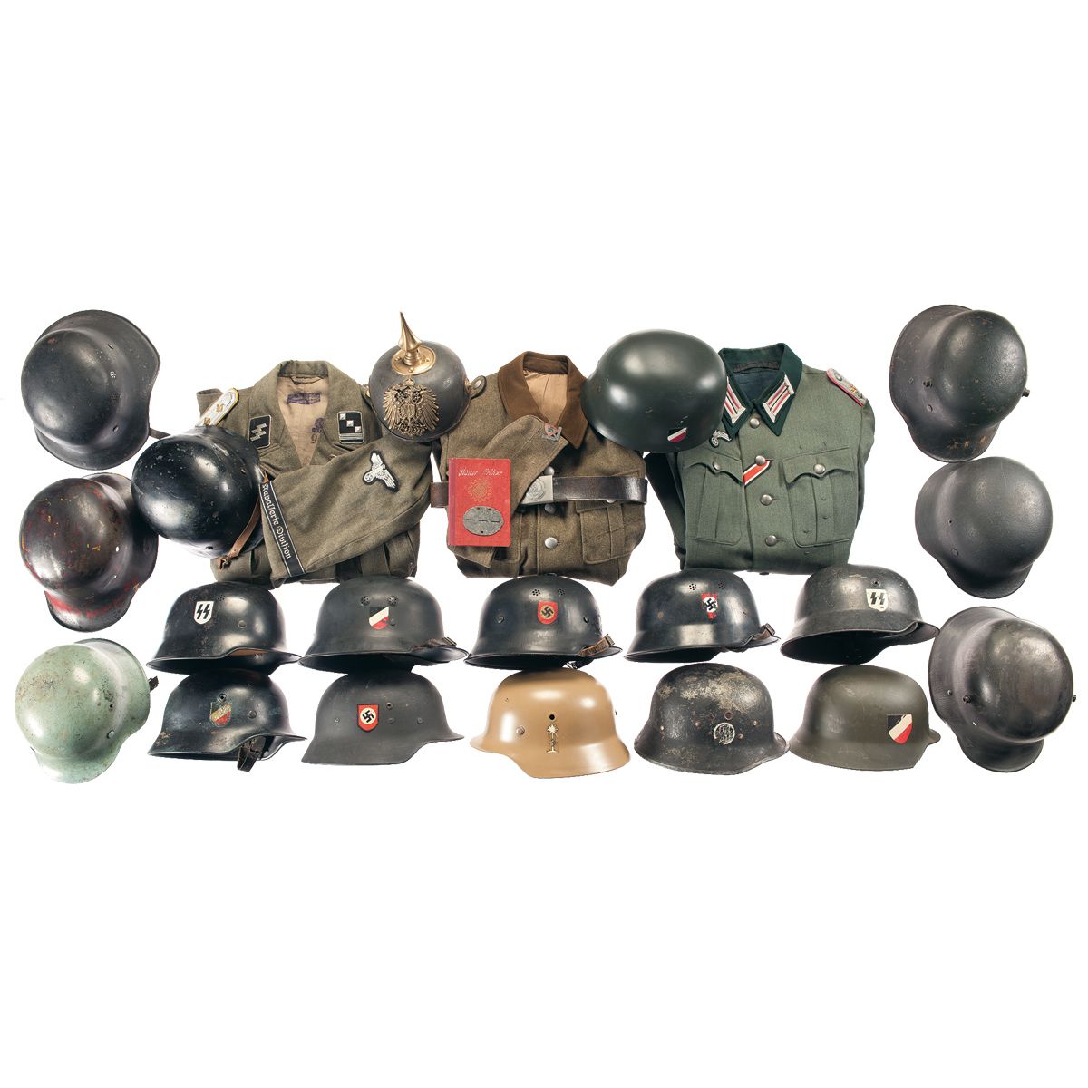1) Nazi jacket, with 1st SS Cavalry Division cuff title, Hauptsturmfuehrer (SS Captain) collar tab and yellow trimmed Rittmeister shoulder boards. 2) Reich Labor Service enlisted jacket, with belt and cap. Black (engineer) trim on the shoulder straps. Includes a R.A.D. dogtag and a German Labor Front logbook. 3) Panzer Oberleutnant (1st Lieutenant) jacket, with "32" numbered shoulder boards and Iron Cross button ribbon. 4) Nineteen German helmets, mostly WWI/WWII stahlhelms, including an incomplete pickelhaub, a Luftwaffe paratrooper helmet, NSKK, SS, Police and Afrika Corps examples. Some helmets may be reproduction. Fair or better overall.
