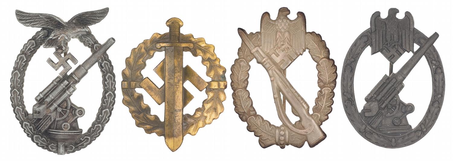 1) Nazi Flak Badge, showing a Luftwaffe eagle over an A-A gun, alloy construction with "G.B." stamped on the rear. Very good, with some spotting on the pin. 2) Nazi Sports Badge, gold colored with makers marks on the rear. Very good, with some rust. 3) Close Combat Badge, unmarked, with an eagle over a rifle with fixed bayonet. Good, with rust on the back. 4) As 1, unmarked, with Nazi eagle and a dark color. Excellent.