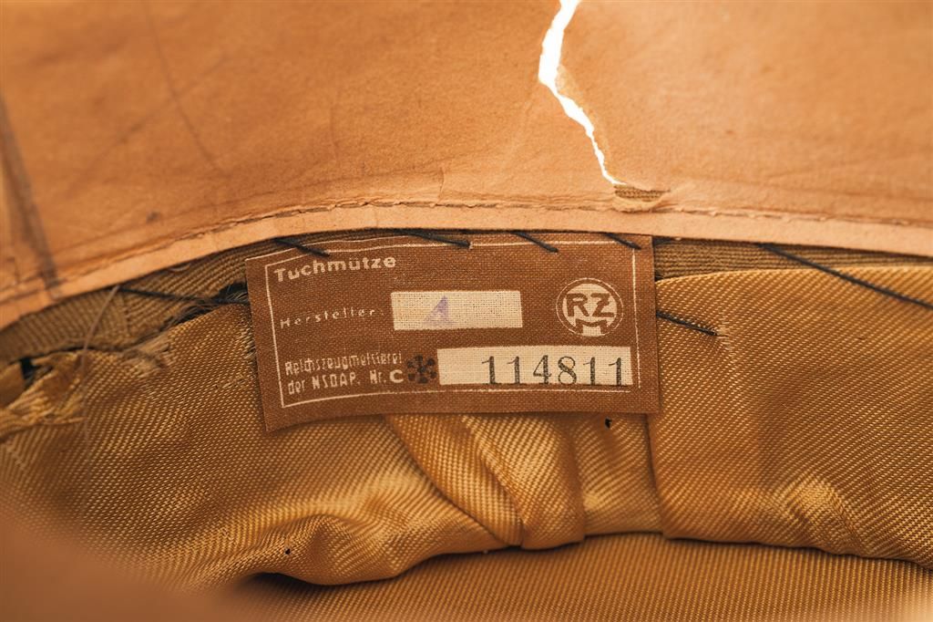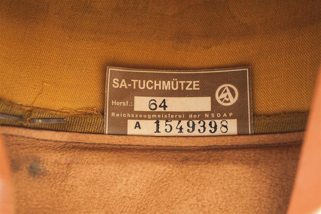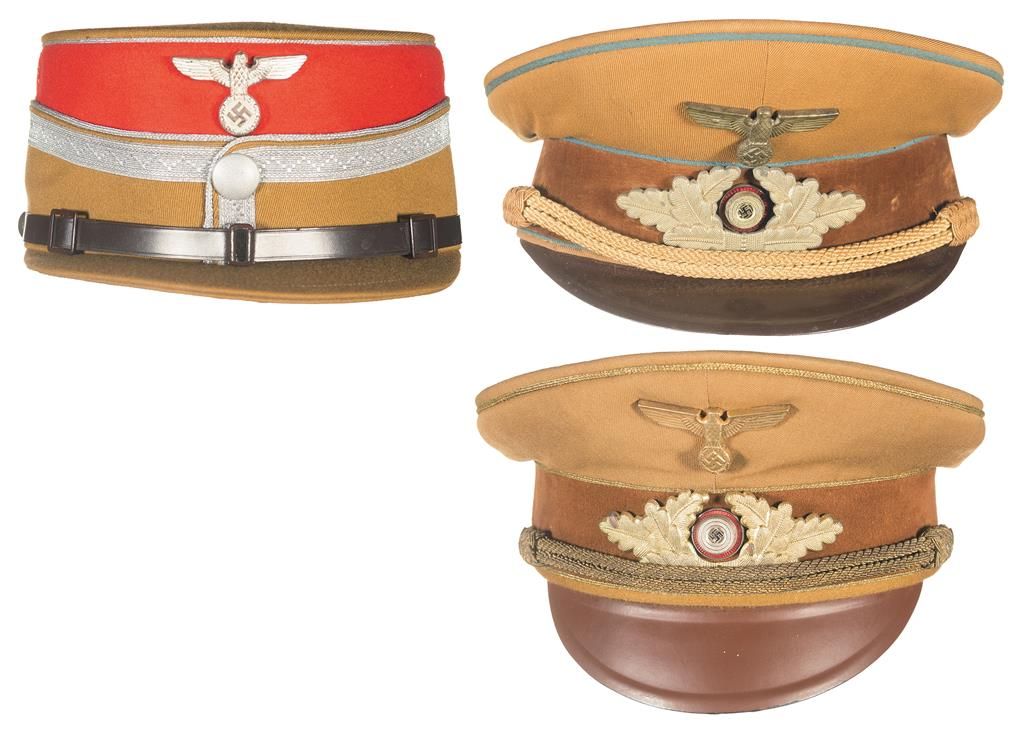 1) SA Group Staff Officer's Kepi Cap, brown construction overall with a red felt band, silver piping and ribbon trip, a nickel finished alloy eagle, and a brown leather chinstrap. The interior is lined in golden yellow cloth, with "57" stamped above the sweat diamond and a brown leather sweatband. 2) Nazi Party District Leader's Peaked Cap, brown cloth construction with light blue piping, brown felt band, gilt-colored eagle and wreath with enamel accented cockade, gold cord chinstrap and a brown leather visor. Fitted with a brown leather sweatband, golden cloth liner, and a RZM property tag numbered "114811". 3) Nazi Reichleitung Official's Peaked Cap, brown construction with a brown velvet band, golden piping, gilt finished eagle, wreath and buttons, enamel-accented swastika cockade, golden wire chinstrap and brown leather visor. Lined with yellow silk, and fitted with a brown leather sweatband. Under the band is a RZM property tag, bearing a "Herstellerfirma" number of "137" and an RZM number "748168".