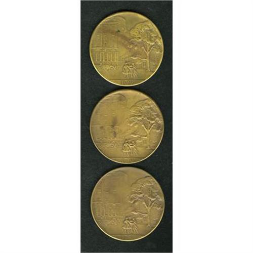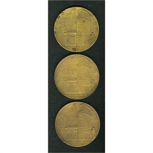 <B>Three New York Stock Exchange Medals.</B></I> Bronze, 70 mm, 132.1 gm. 130th anniversary, 1792-1922. Struck by Medallic Art Co. of New York. The three medals bear identical designs. One of the medals has spots.<BR><BR><b>Shipping:</b> Coins & Currency (<a target="_blank" href="http://www.heritageauctions.com/common/shipping.php">view shipping information</a>)