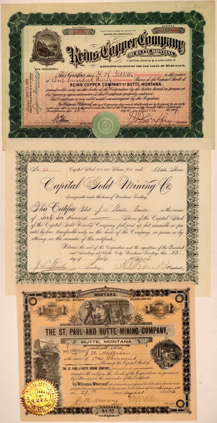These three certs are all in wonderful condition. 1) St. Paul & Butte. 1896. # 109. Extremely nice condition. Capital Gold Mining Co. # 73 for 6,600 shares. 1888. Very nice condition. 3) Reins Copper Company. Extremely nice condition. In 1904 this shaft was 800 feet deep. Near the Leonard and Minnie Healy mines. City: Butte State: Montana Date: 1888-1909
