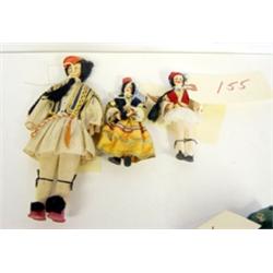 These three nylon covered cloth dolls are tourists dolls dressed in colorful and ornate native outfits. One male is approximately 8 inches, the other male is approximately 5 inches and the woman is approximately 5 inches. They are all in good condition.