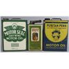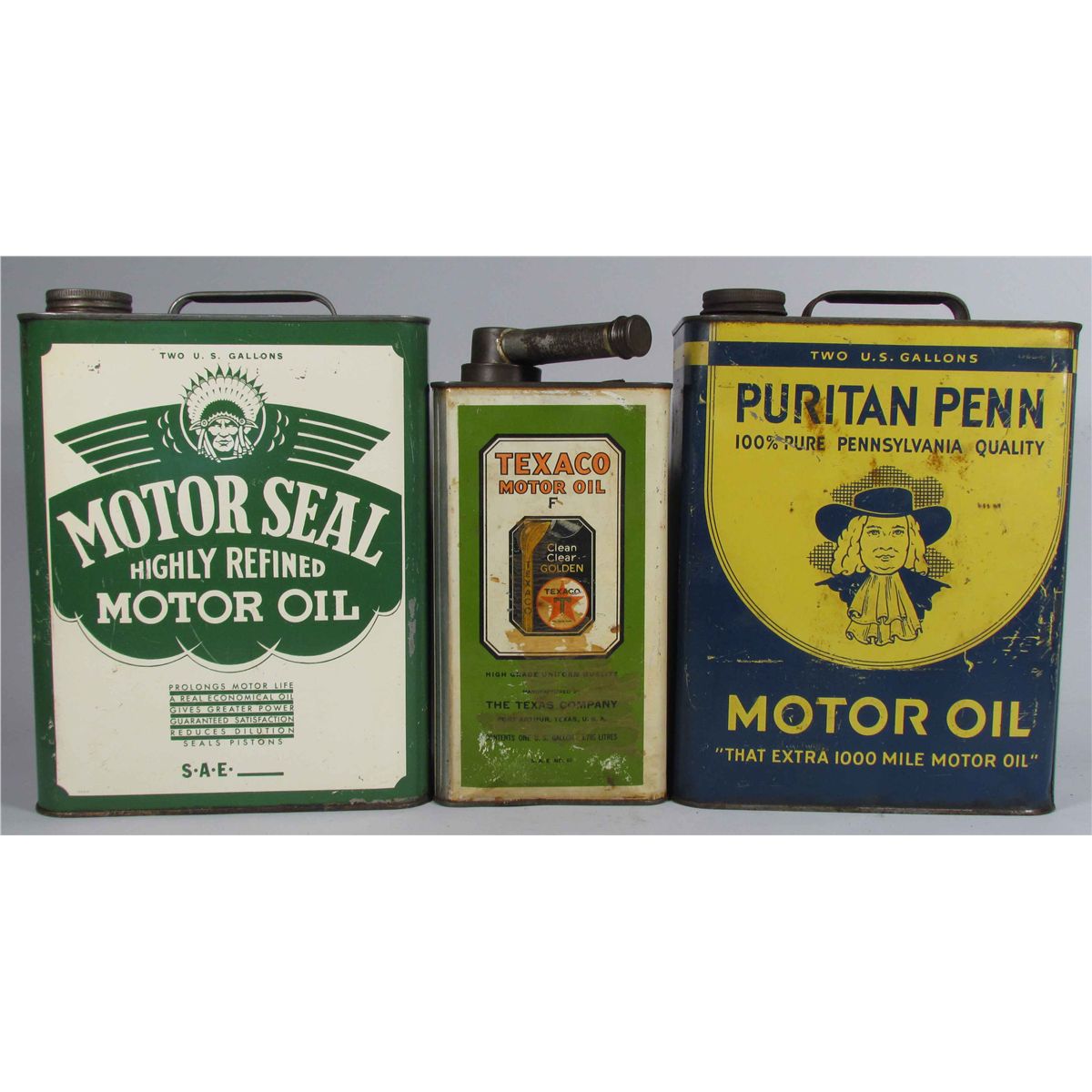 Three Oil Cans including 2 gal Puritan Penn, 2 gal Motor Seal Motor Oil and Texaco Motor Oil. Very good to fair condition.