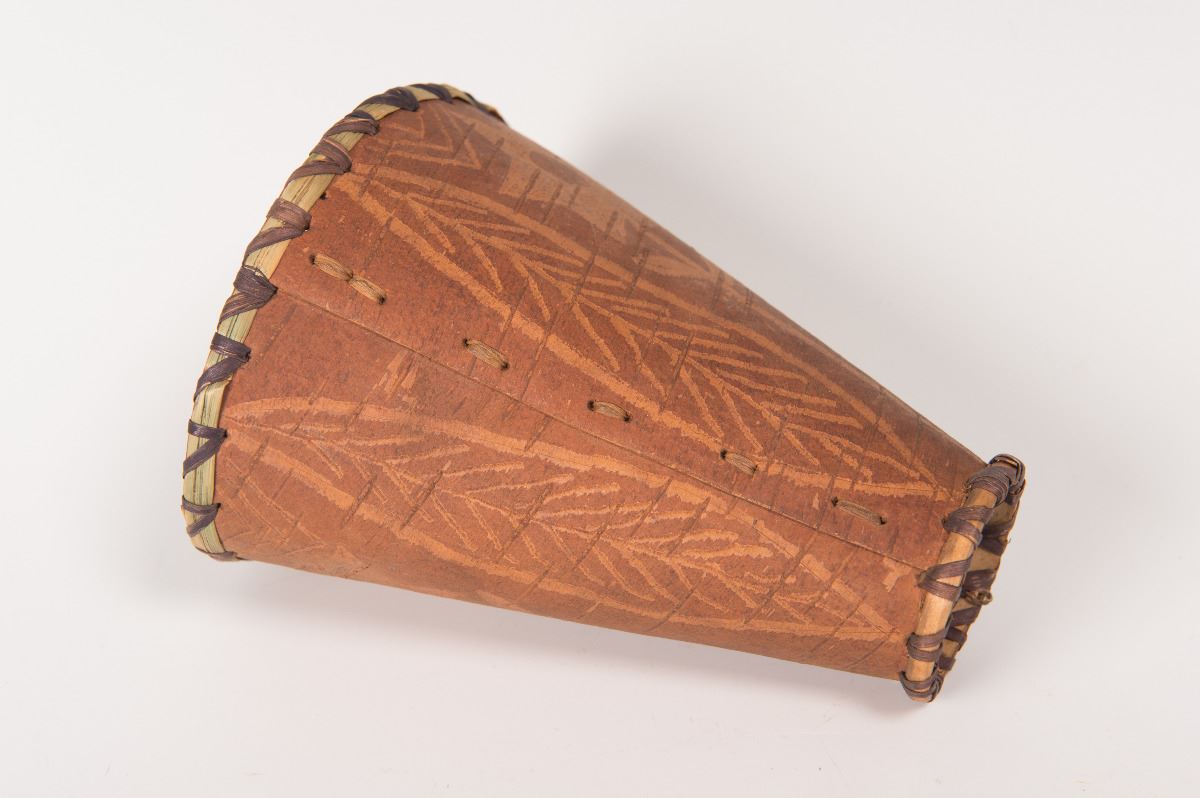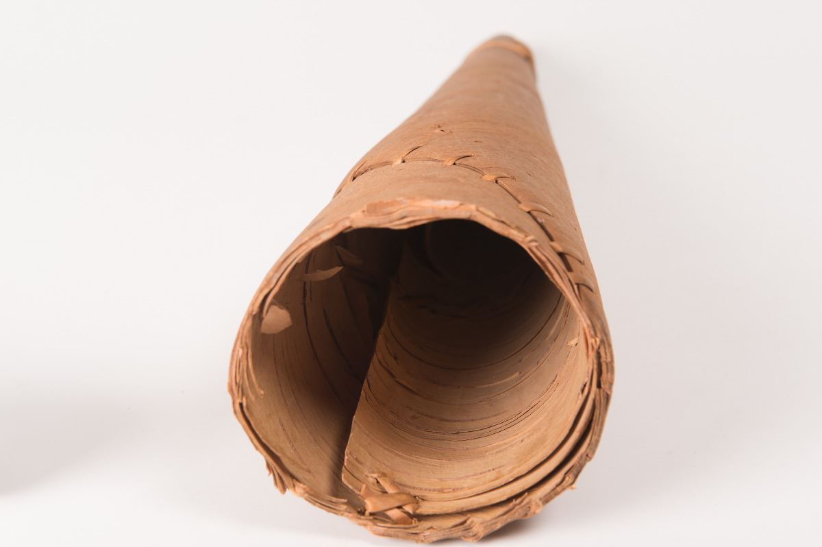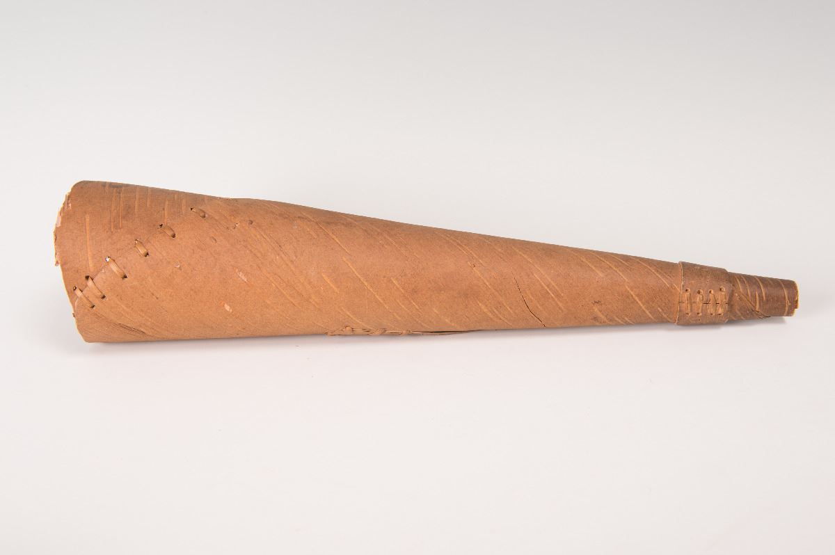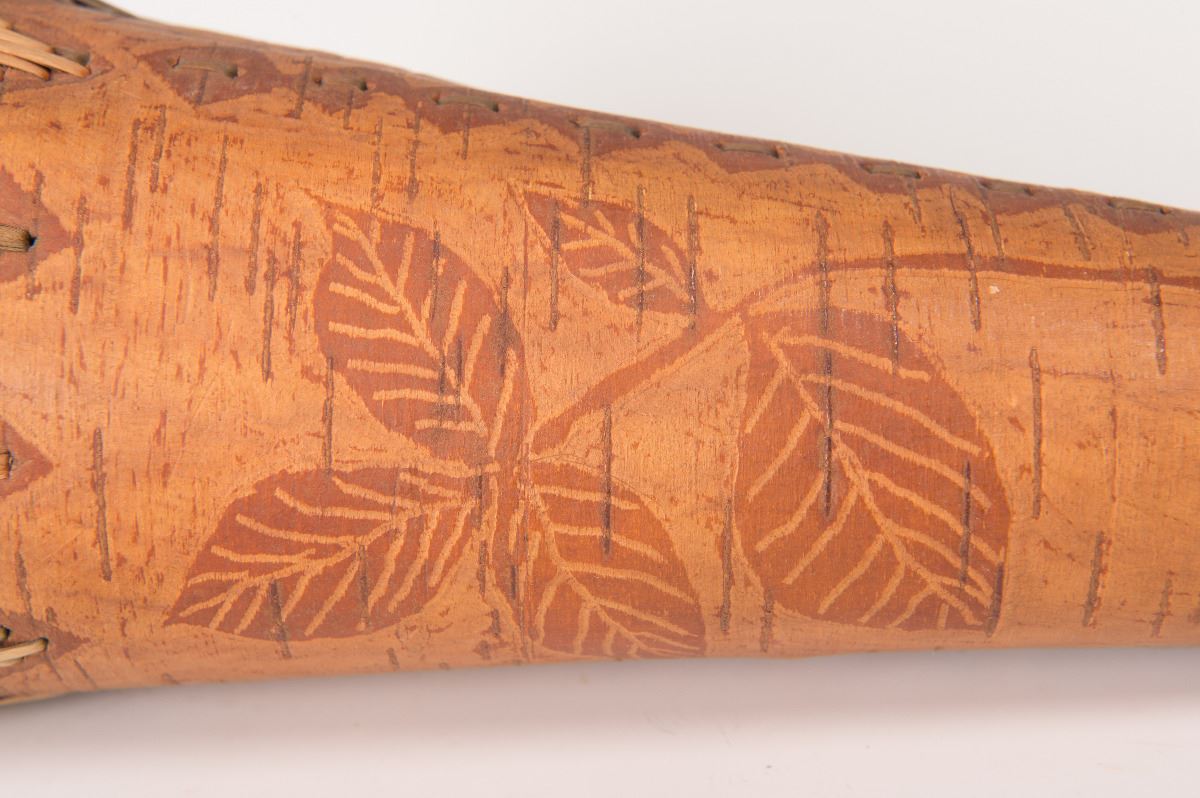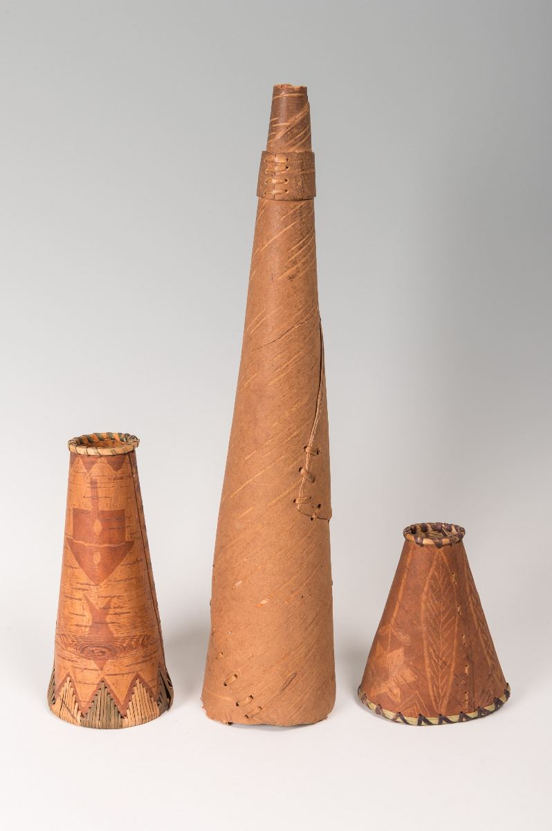Three Ojibwa Birch Bark Moose Calls. Two with fine, scratch-carved designs. 19", 9" and 6" high. 19th century. Provenance: Ex: Historic Fort Mille Lacs Trading Post and Museum, Mille Lacs Indian Reservation, Onamia, Minnesota.