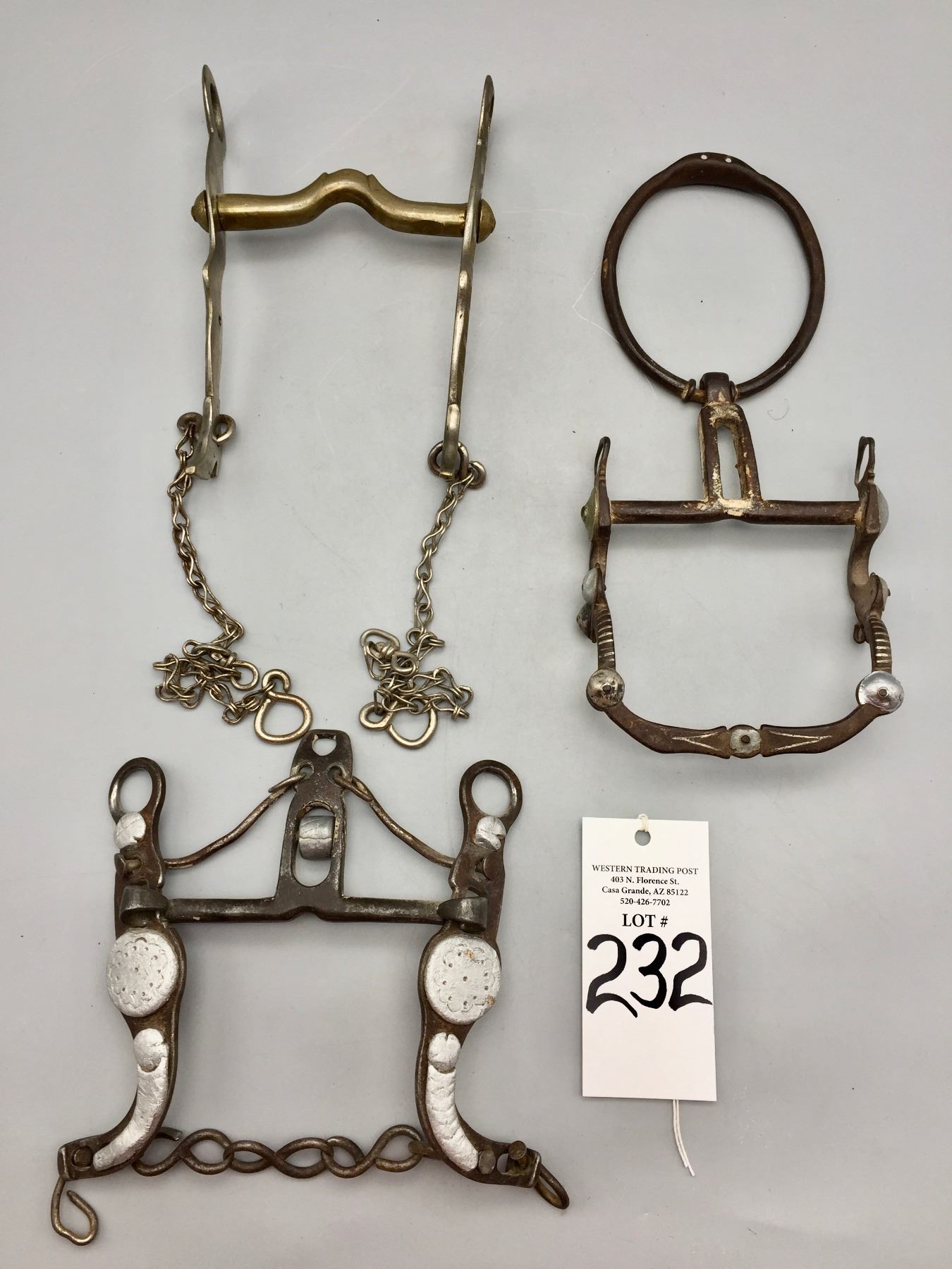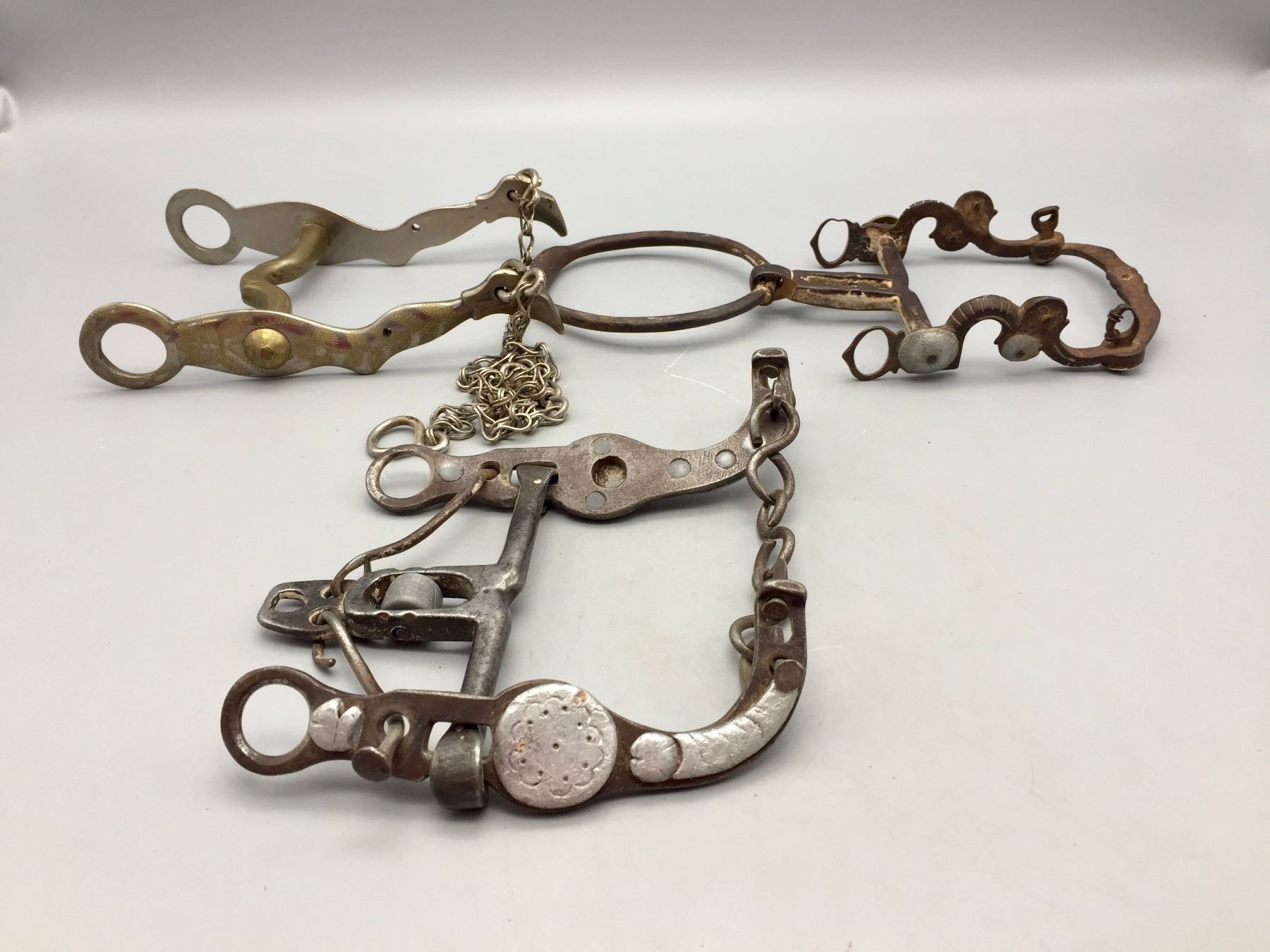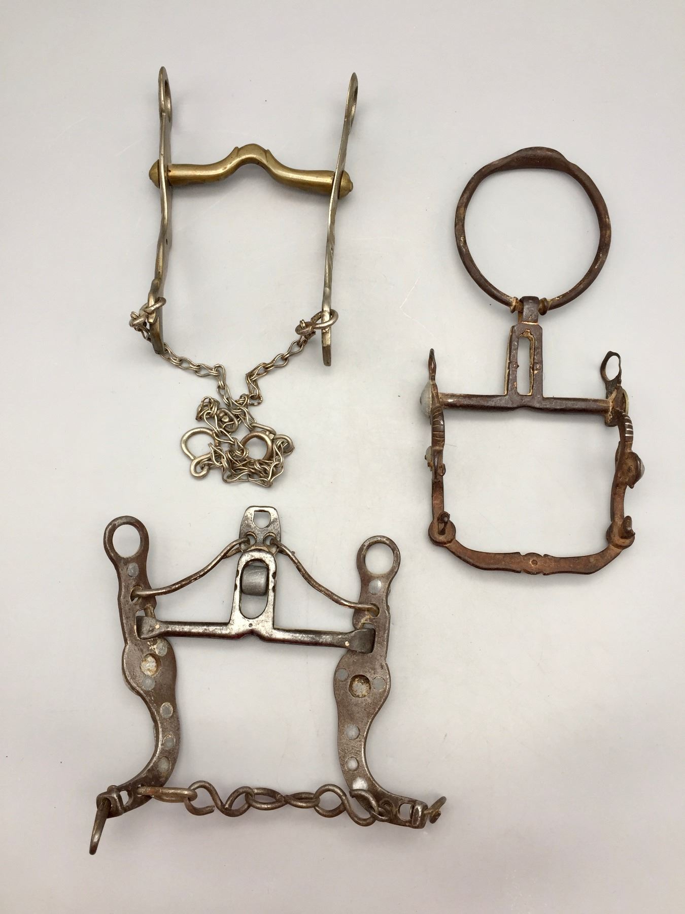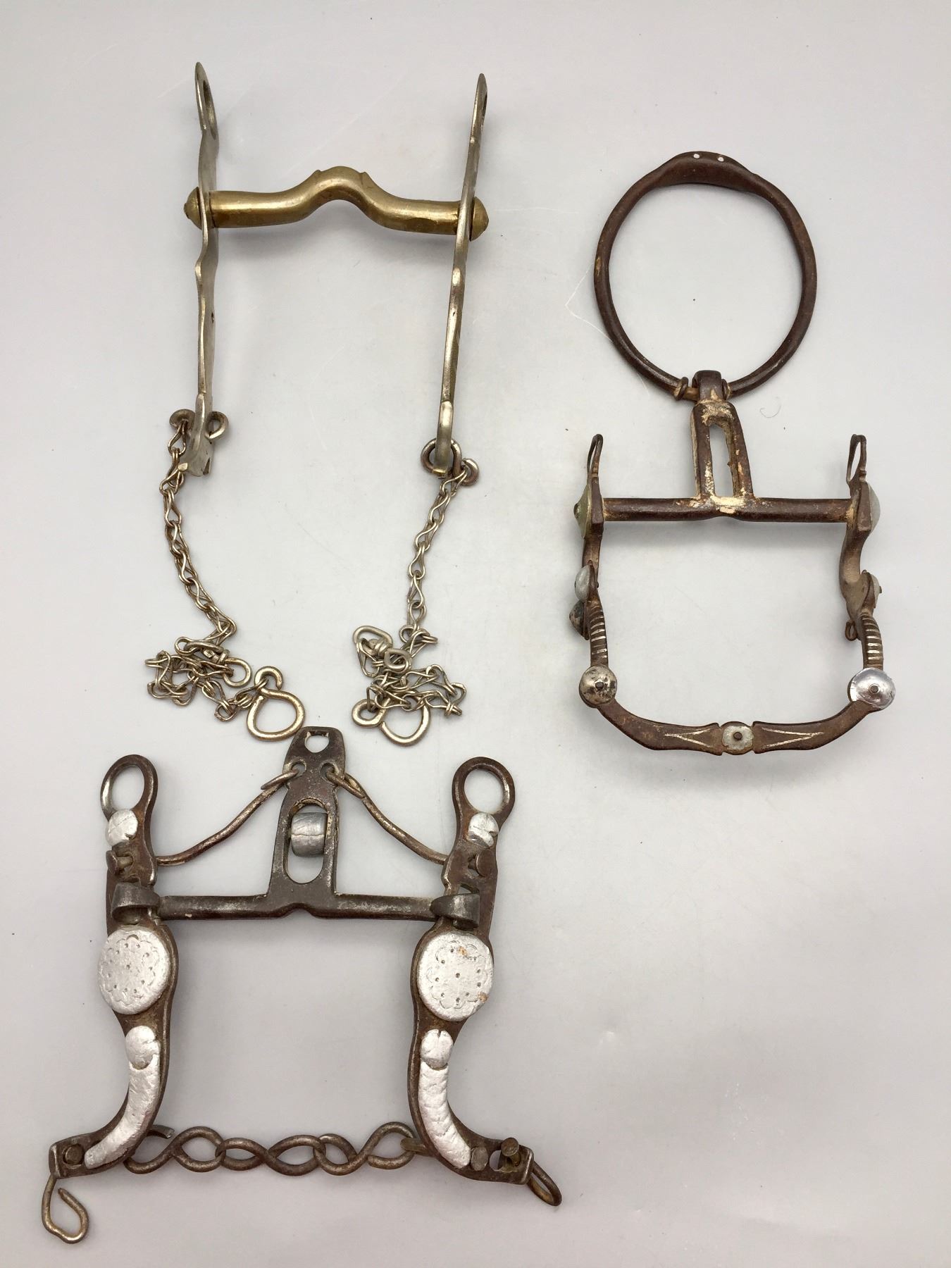 Description: Included for sale in this lot are three old bits in various sizes and styles.                                                                                                           Maker: Unknown.                                                                                                                   Approx. Age: Vintage.                                                                                                            Size: 4-3/4” mouth, 6-1/4” shank to 4-1/4” mouth, 7-3/4 shank.                                                                                                                                                                                                                                 Condition: Pretty good for their ages, wear expected.                                                                                                                Please look closely at the pictures - they are an important part of our description.                                Shipping: There will be a $5 handling / packaging fee for shipping this lot. The actual cost of postage will be added on top of that.