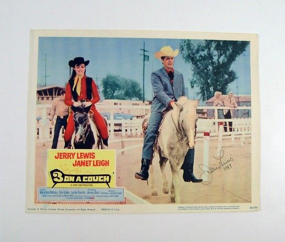 If one Jerry Lewis was box office gold in the 1960's, just imagine what five would be! That's the premise of "Three on a Couch" (1966), the Jerry Lewis directed and starring comedy, in which he has to disguise himself as three men (and a woman) in order to cure his finance's patients so he can take her to Paris with him. This is an original Lobby Card from this rollicking comedy, personally signed by Jerry Lewis. Card is 14"x11".