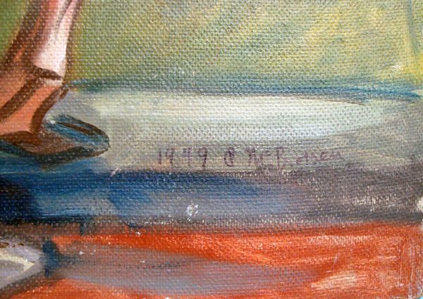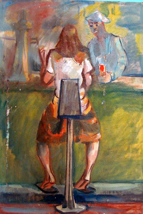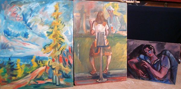 Three Original Paintings by Preston McCrossen. Largest measures 30'' x 2'' W. On Masonite. Soda fountain painting is signed and dated 1949. Preston McCrossen was born in Clyde, MI on Dec. 5, 1894. Formerly of New York, McCrossen was in Taos, NM before moving to Mill Valley, CA in 1927. By 1936 he had moved to Santa Fe, NM where he remained until his demise in September 1981.