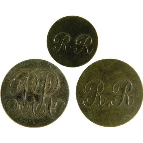 <B>Three Original Rifle Regiment Buttons.</B></I> Three interesting variations of Rifle Regiment buttons including a 15mm and 20mm one piece with plain script letters (RF 1A), and a 20mm one piece version with foliated script letters (RF 2), all complete with shanks and in fine condition.<BR><BR><b>Shipping:</b> Miscellaneous Collectibles, Smal (<a target="_blank" href="http://www.heritageauctions.com/common/shipping.php">view shipping information</a>)