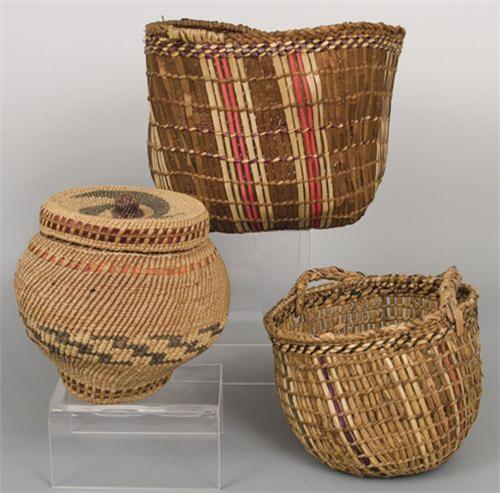 Three Quileute Baskets. Two used for clamming are 6 ½” and 9" tall. One lidded basket is 7" tall. All good condition. (est $400-500)
