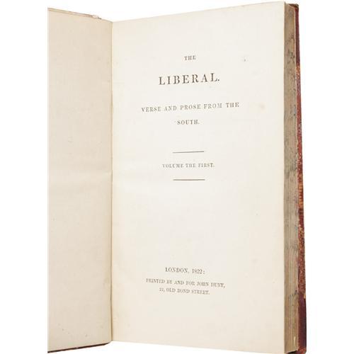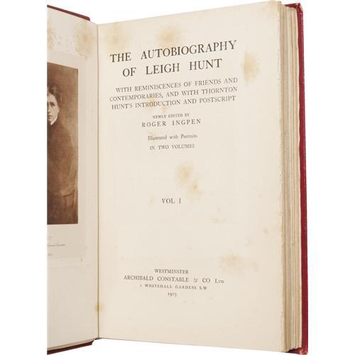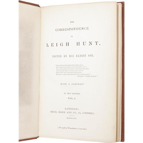 <B>Three Outstanding Leigh Hunt Collections.</B></I> James Henry Leigh Hunt was born in England of American parents, forced to leave America due to their loyalist leanings. Leigh was a poet, newspaper editor and close friend of the Shelleys'. Hunt is best known for his poem "The Story of Rimini". He left for Italy in November 1821 at the invitation of Percy Bysshe Shelley and Lord Byron, in order to start a liberal quarterly magazine. Storm, sickness, and misadventure retarded his arrival until July 1, 1822, a rate of progress Thomas Love Peacock compared to the navigation of Ulysses. Shelley and another closed friend, Edward Williams sailed across the Bay of Spezia to welcome the Hunt family to Italy. After a week-long visit, on July 8, 1822, both men drowned during their return voyage. Mary Shelley's inscription in the copy of The Months offered in this auction was written four days after her husband's body was cremated at Viareggio. On September 11, Mary and her son Percy moved to Genoa and lived with the Hunts near Byron.<BR><BR>Leigh Hunt's life was fraught with mismanaged affairs, both legal and financial. In 1844, when Hunt found himself most wanting, Mary Shelley and her son Percy, having come into their inheritance, bestowed Leigh with an annuity of 120 pounds. In spite of his faults, Leigh Hunt was a consummate man of letters, and this lot offers three collections of Hunt's literary output.<BR><BR><B><I>Correspondence of Leigh Hunt</B></I>,</B></I> (London: Smith, Elder and Co., 1862), two volumes, Volume I: 333 pages, followed by 18 pages of advertisements; Volume II: 331 pages, reddish brown cloth binding with blind stamping on the boards and gilt lettering on spine, 8vo (5.25" x 8"), clear protective dust jacket on both volumes. Volume I is good, with general shelf wear, some rubbing to the gilt spine lettering, and the textblock has separated at page 224, with several loose leaves resulting. Volume II is also good, with textblock separated at page 80, with general shelf wear, including bumped edges. All leaves present for both volumes.<BR><BR><B>Four volume-set of <I>The Autobiography of Leigh Hunt</B></I></B></I> <I>with Reminiscences of Friends and Contemporaries, and with Thornton Hunt's Introduction and Postscript,</B></I> edited by Roger Ingpen (Westminster: Archibald Constable & Co., 1903), two parts with two volumes each, Volume I, Parts I & II: 260 pages; Volume II, Parts I & II: 315 pages, including appendices, bibliography and index, red cloth boards, deckled edges, top edge gilt, 8vo (6" x 8.75"), Illustrated with numerous engraved plates & facsimiles of correspondence. The four-volume set is generally very good, with minor shelf wear to the edges, boards, and spine. Gilt lettering is clear on the spines, and the binding is tight on all volumes. Very mild foxing present. The index in Volume II, Part II has been annotated in pencil by a previous owner. <I>Ex-Libris</B></I> bookplate present in both parts of Volume I. A very attractive set.<BR><BR><B><I>The Liberal, Verse and Prose from the South</B></I></B></I> <I>with Betty Bennett's Handwritten Notes,</B></I> (London: John Hunt, October 1822, and July 1823), second edition, two volumes, Volume I: 399 pages; Volume II: 377 pages, half-leather binding with marbled boards and endpapers, includes the preface to "The Vision of Judgment". <I>The Liberal</B></I> was founded by Percy Bysshe Shelley, Leigh Hunt and Lord Byron, who, with William Hazlitt, were the major contributors. This set is good, though the front board of each volume is detached and taped to the spine. The rear board of Volume II is also detached and taped. The boards of both volumes are rubbed, corners are bumped, with worn edges. Mild foxing present to the endpapers of both volumes. Dr. Bennett's pencil annotations identifying authors present in the table of contents of both volumes, making this a true treasure for any Shelley scholar or Shelley collector. <I>From the Betty Bennett Collection.</B></I><BR><BR><b>Shipping:</b> Books & Catalogs (<a target="_blank" href="http://www.heritageauctions.com/common/shipping.php">view shipping information</a>)