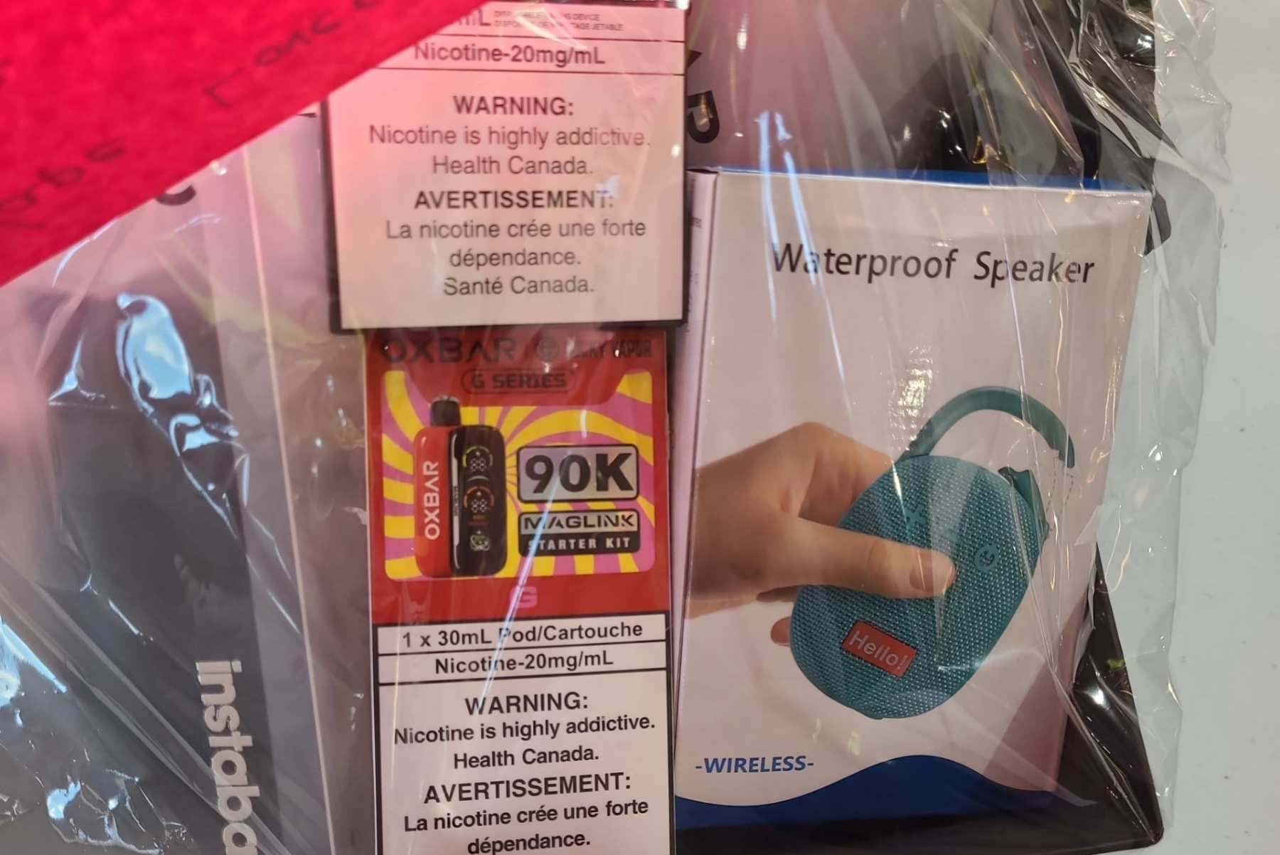 Three Oxbar Vapes, Wireless Speaker Bl/ Red, Travel Pillow, Coffee Flask, Water Bottle Valued: $238