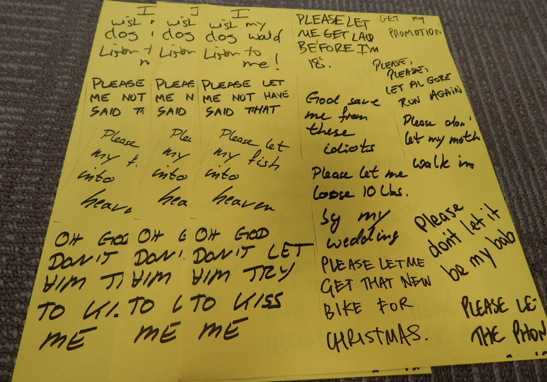 Set of three screen used pages of prayer notes featured in the film Bruce Almighty starring Jim Carrey and Morgan Freeman. All items come with a certificate of authenticity good for the life of the piece.