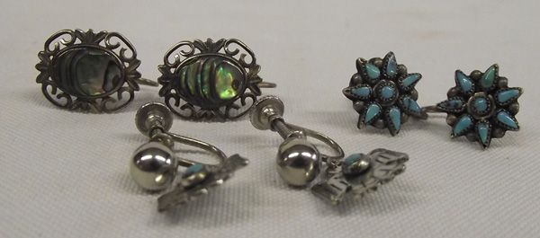 Three Pair Turquoise Sterling Screwback Earrings. 1) Abolone set in sterling are 3/4L x 1/2''W. 2)Cluster earrings are /5'' diameter. 3) are thunderbird style ans all are marked sterling. Three for one!