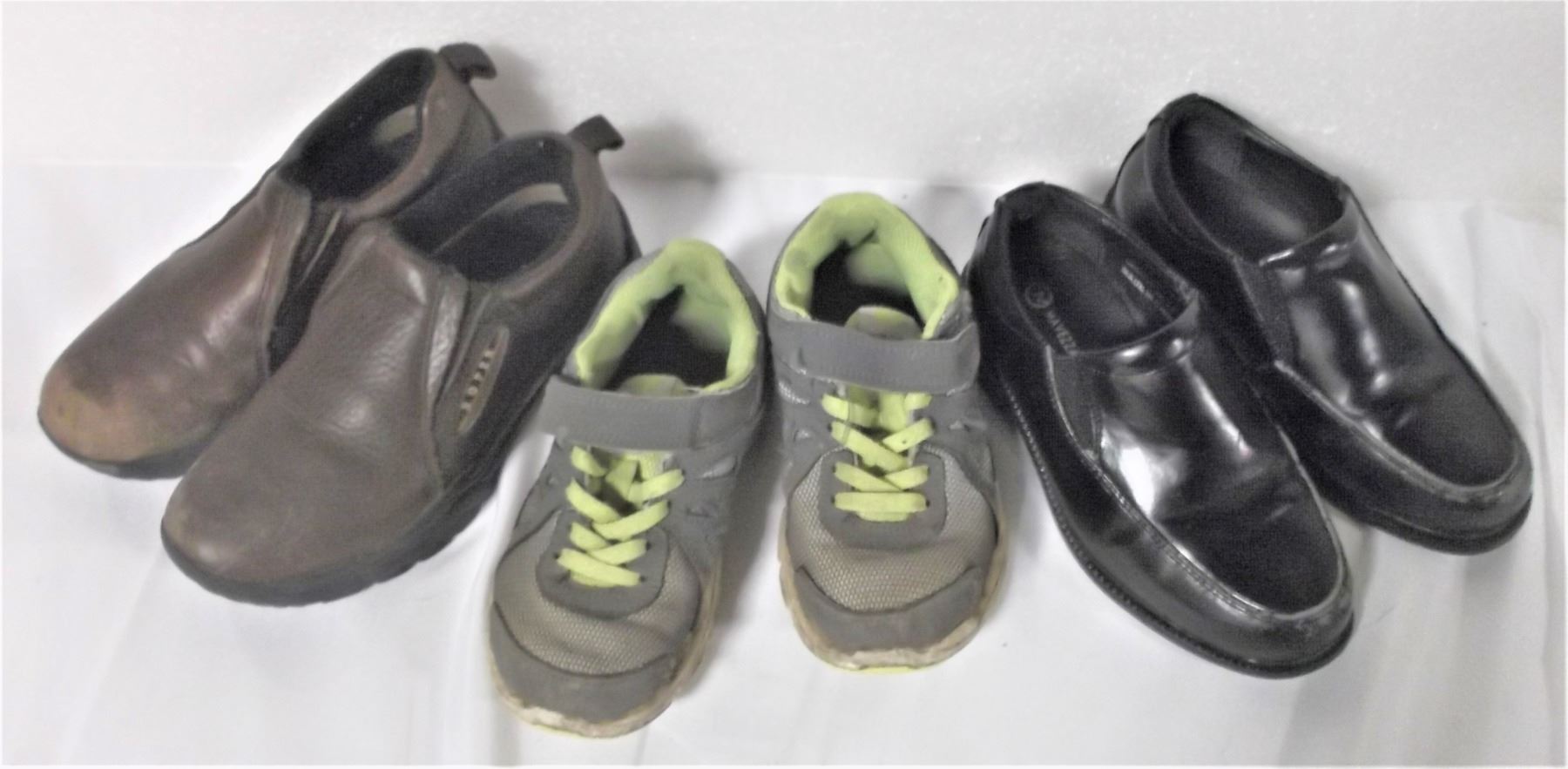 Sneakers are size 12, black dress shoes size 13, brown shoes size 1.