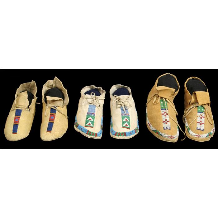 Three Pairs of Moccasins. (1) Arapaho Beaded Moccasins. 9" long. C. 1890. (2) Arapaho Partially Beaded Moccasins. 10" long. C. 1890. (3) Sioux Partially Beaded Moccasins. 9" long. C. 1900s. (est $2,000-3,000)