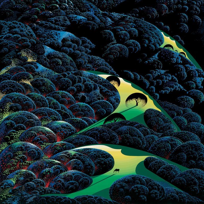 "Three Pastures On A Hillside" is a limited edition serigraph on paper by Eyvind Earle (1916-2000). The piece is numbered, hand-signed by the artist, and accompanied by a certificate of authenticity. Measures approximately 36" x 27" (image).