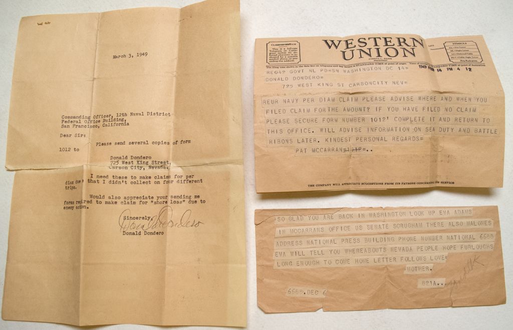 All pertaining to Don Dondero and his pursuit of disability form his service in the Navy. Letter is ripped at the middle fold.
