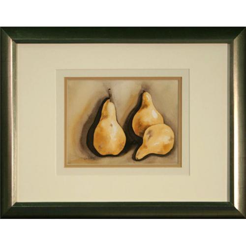 Pat Gilbart?s original watercolor entitled, ?Three Pears,? is a beautifully rendered painting of a small grouping of ripe pears. The dramatic use of light and dark to create deep shadows and bright highlights help to thrust the pears into three-dimensions. The soft golden pears rest against a neutral beige background creating a warm natural feel. The painting was triple mounted with golden tan on the bottom to draw out the warmth of the composition, a second layer of soft candlelight white, and a third layer of medium cream to really give the eye a dramatic entryway into the piece. The piece is beautifully mounted in a light gold wooden frame that appears silver in certain light and compliments the wonderful gold tones of the pears with absolute perfection. The unique matting and framing presentation of this piece was individually selected and created by Le Chateau?s renowned master framer, Jeanette Shoenrock, and bears her signature on the back.