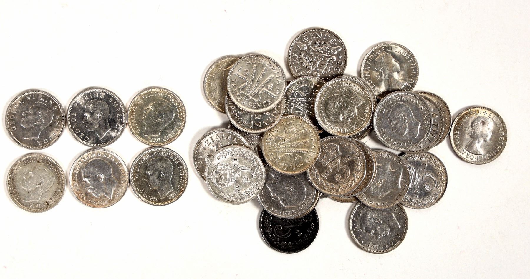 Collection of 36 three pence silver coins from Great Britain, Australia and New Zealand. Mostly uncirculated. 1900s-1940s mostly.