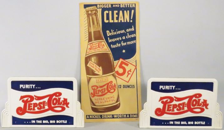 Three Pepsi Cola, Point of Purchase, Signs. All three Double Dot. One cardboard and 2 plastic. All in Excellent Condition.