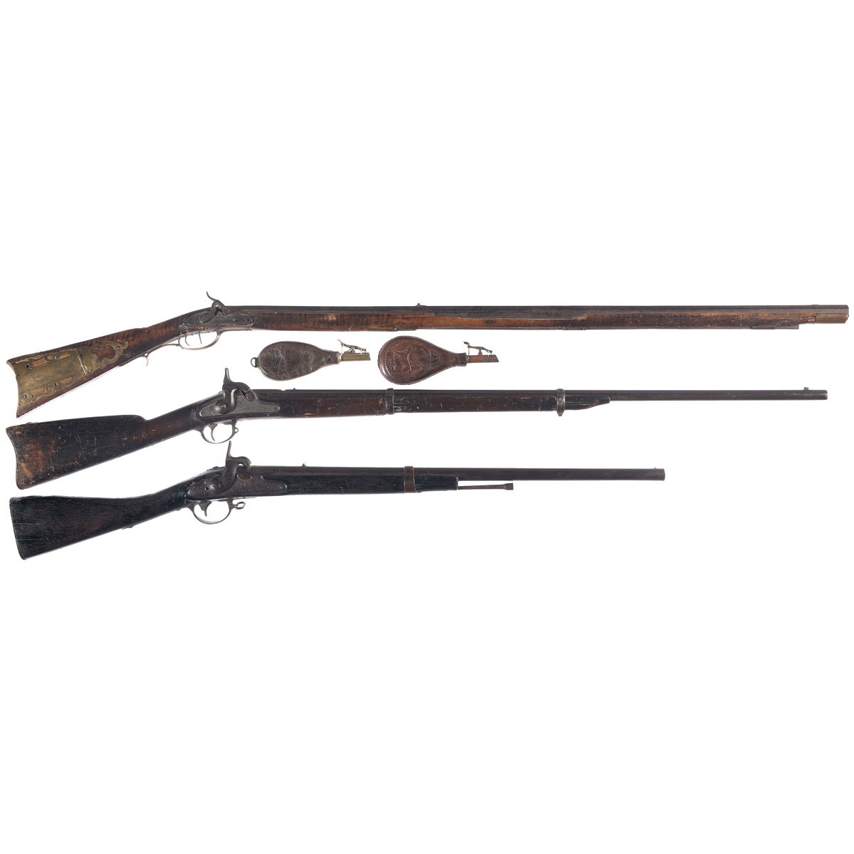 With two leather powder flasks, (both good, one missing lanyard ring).