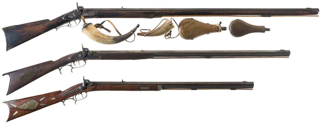 Three Percussion Rifles Flasks and Powder Horns -A) Unmarked Full Stock Rifle