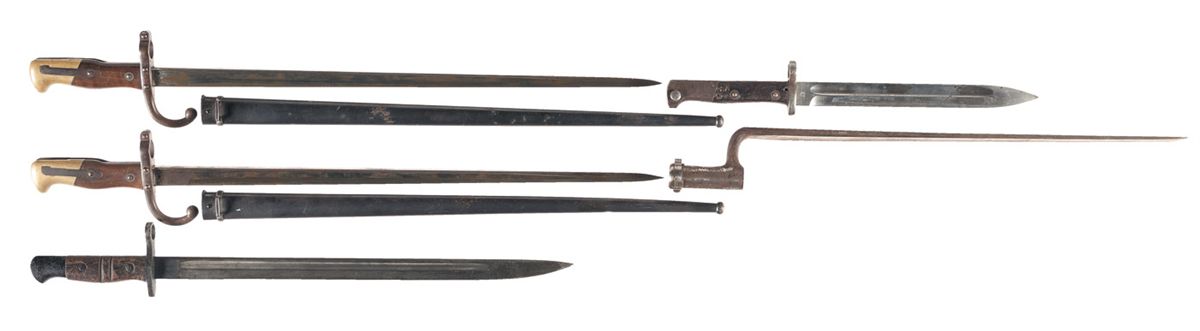 With 1) etched blade U.S. marked sword. 2) 2 M1874 bayonets with sheaths. 3) Remington 1917 bayonet. 4) Steyr M12 bayonet. 5) "J.D.G." marked angular socket bayonet.