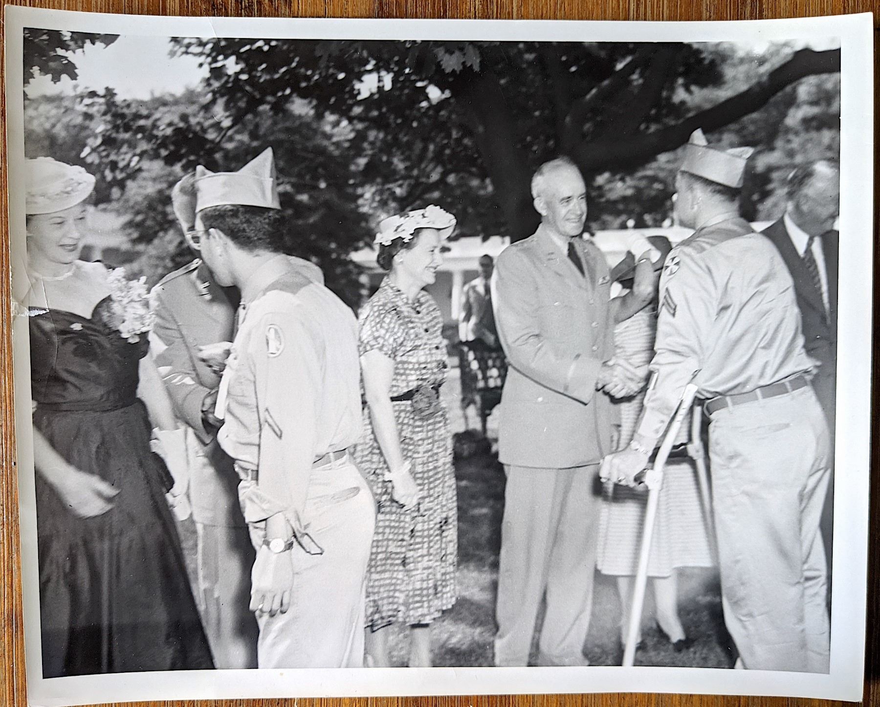 2) General Omar Bradley shaking hands with wounded veterans of WWII.