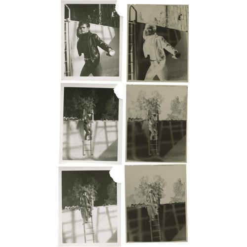 <B>Three Photos from "Rebel" Pool Scene with Negatives.</B></I> The attack of a gang member, caught in three ominous shots. Each is time and date-stamped by the film developing lab, and all three have torn upper right corners but come with the undamaged negatives.<BR><BR><b>Shipping:</b> Other (oversized items, group lo (<a target="_blank" href="http://www.heritageauctions.com/common/shipping.php">view shipping information</a>)
