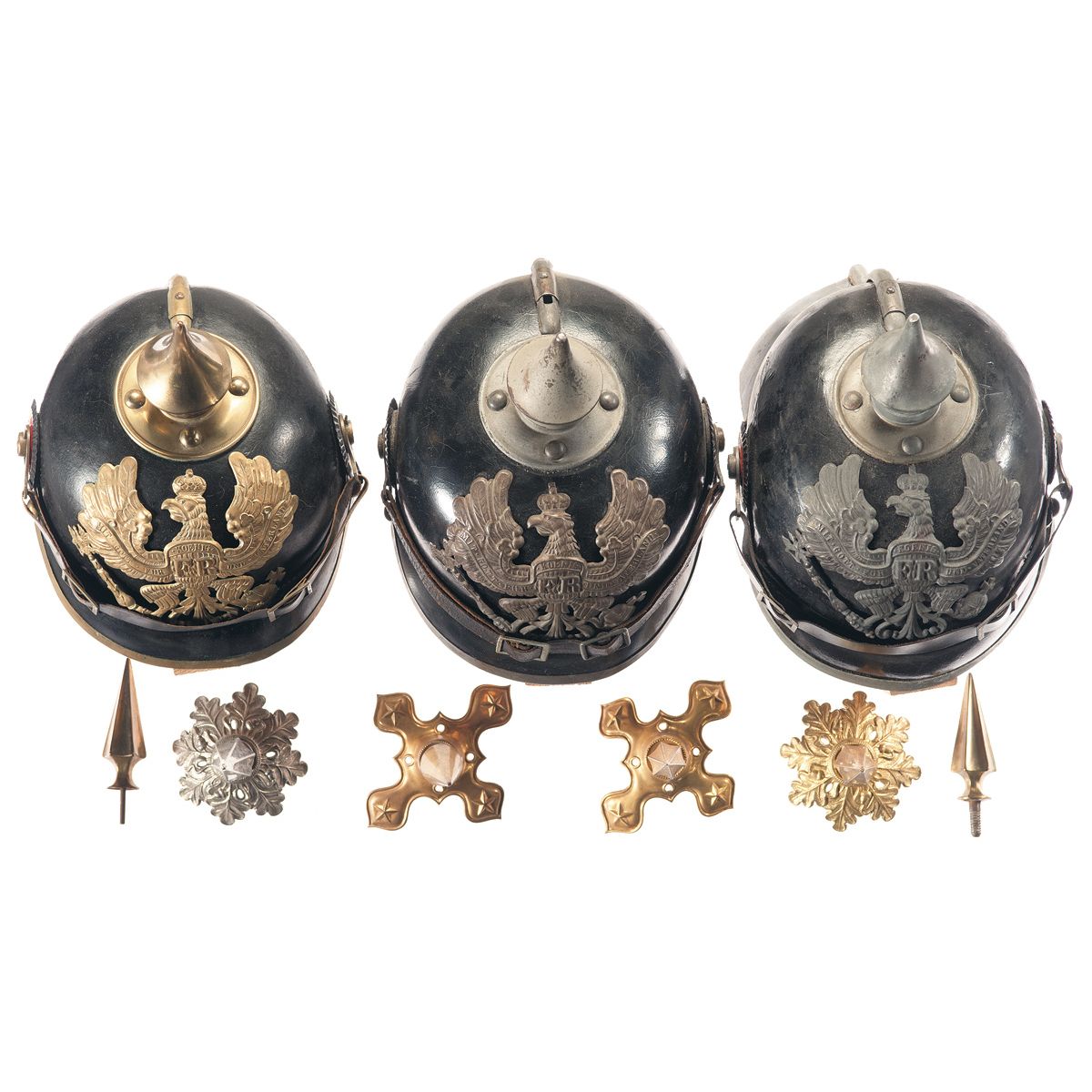 3 picklehaubes (in good condition with 1 having a partially attached helmet plate), 6 picklehaube spikes (4 have a base).