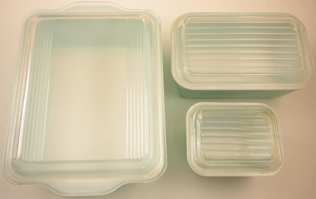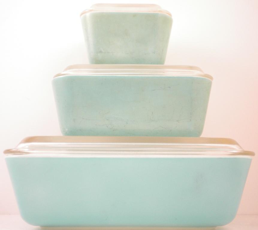 An original set of Pyrex containers. The first is 9 inches x 7 inches x2 inches. The second is about 7 inches x 4 inches x 2 inches; and the third is about 4 inches x 3 inches x 2 inches. These would look great in a retro kitchen. They show signs of use and wear, but have no chips or cracks.