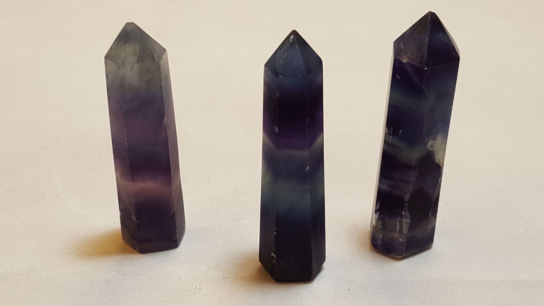 Three piece flourite healing 6 point gem lot. Total weight is 60 grams. These beautiful muliti color healing flourite wand points have a flat bottom cut so can be self standing.