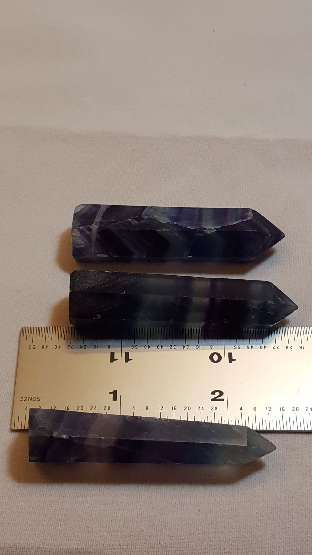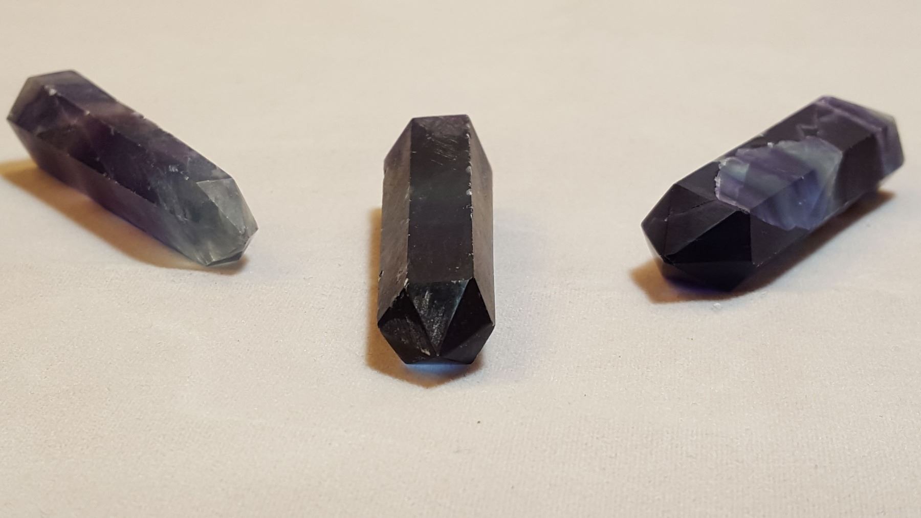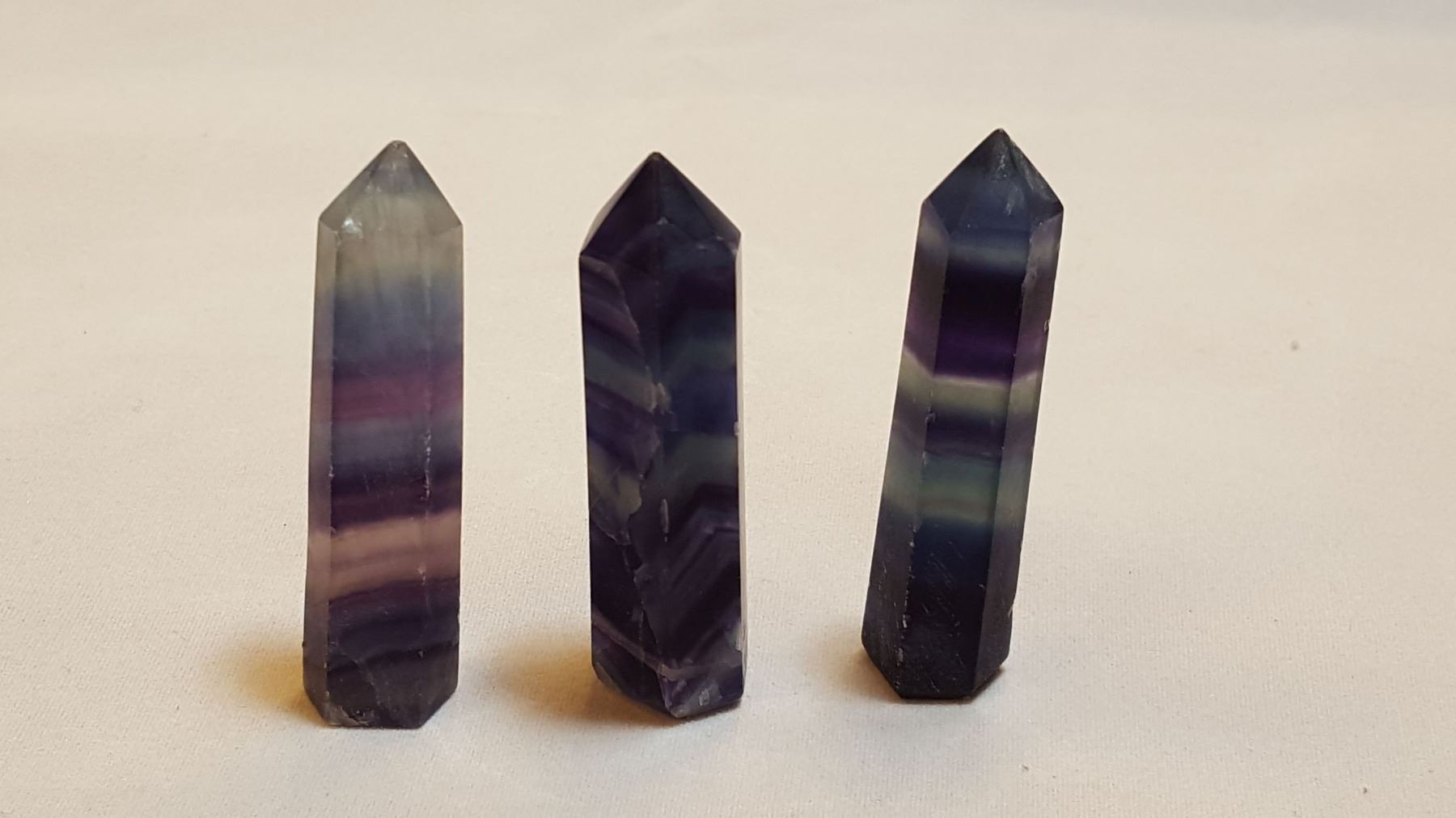 Three piece flourite healing 6 point gem lot. Total weight is 60 grams. These beautiful muliti color healing flourite wand points have a flat bottom cut so can be self standing.