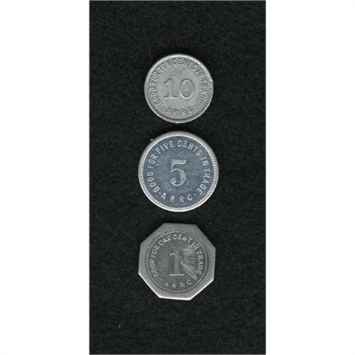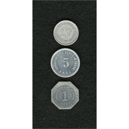 <B>Three-Piece Lot of 1935 Alaska Bingle Tokens.</B></I> Three different-denomination tokens issued by the U.S. government for the use of the colonists of the Matanuska Valley Project in Alaska. One 1 cent (with scratches), 5 cents (Uncirculated), and a circulated 10 cent token. The current 2008 <I>Guide Book</B></I> value (page 389) totals about $300.<BR><BR><b>Shipping:</b> Coins & Currency (<a target="_blank" href="http://www.heritageauctions.com/common/shipping.php">view shipping information</a>)