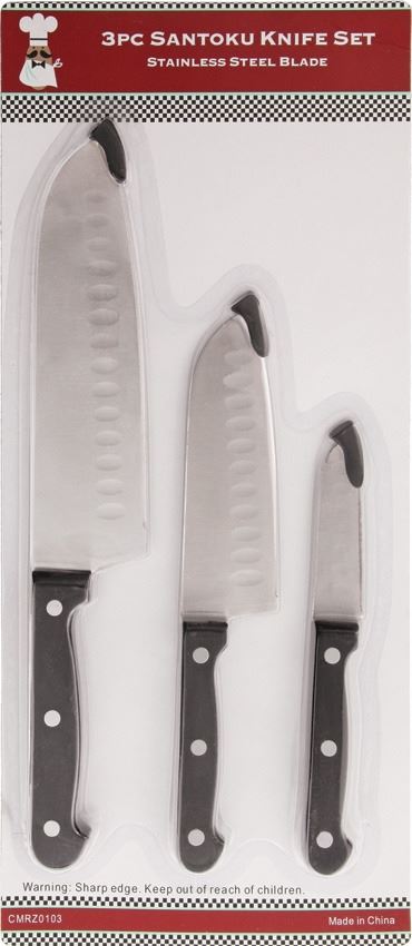 Knives feature stainless blade, full tang, and black composition handles. One 12" overall with 7" blade; one 9" overall with 5" blade; one 7" overall with 3" blade.