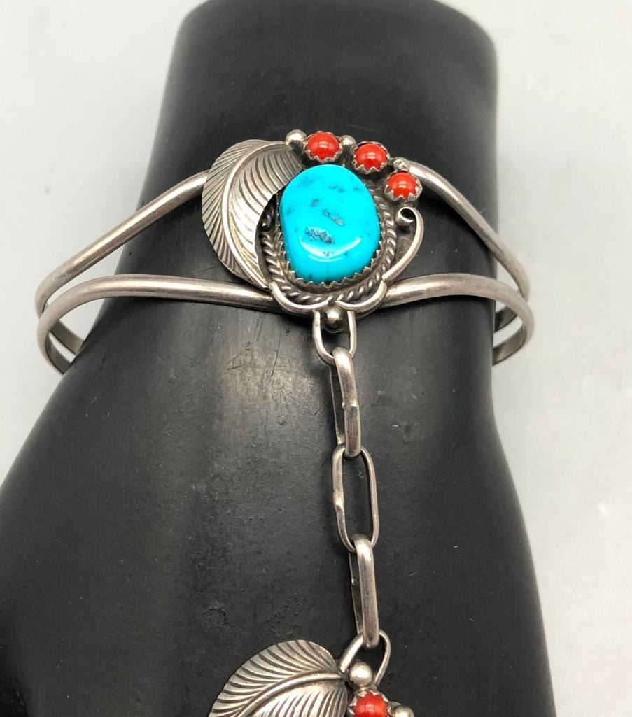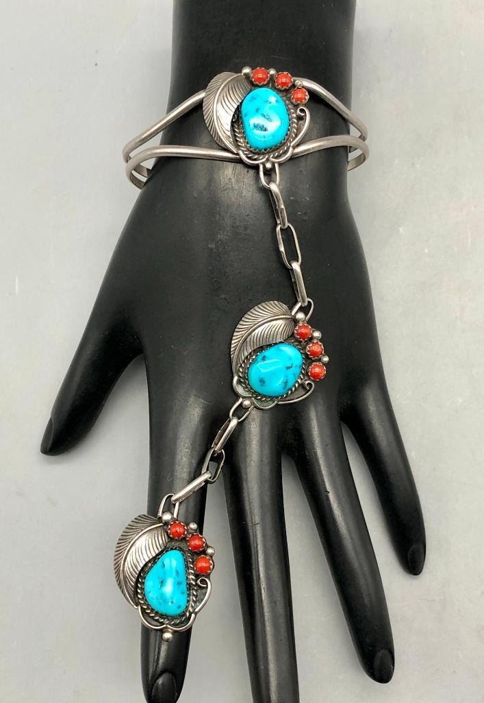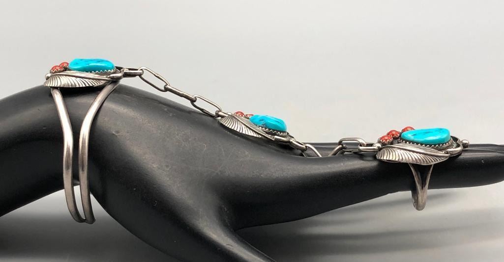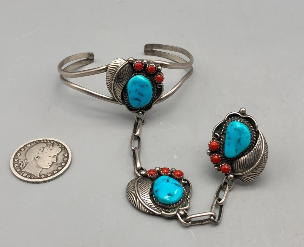 Presented for sale in this lot is a vintage three piece "slave" bracelet. This is a gorgeous bracelet set with turquoise cabochons and accented with coral dots around the bottom and silver leaf applique throughout. It is sterling silver and has an elegant look to it. MAKER/ARTIST: Hallmarked Allen Chee. (Navajo). APPROX AGE: Circa 1970s. SIZE: Inside circumference measures 5-1/4 inches long. Opening is an additional 1 inches, fitting a 6-1/4 inch wrist. Ring is a size 6.5. Weighs 27.1 grams. CONDITION: Good for its age, normal wear expected. Please look closely at the pictures as they are an important part of our description and are hereby incorporated into the description, specifically with regards to condition. SHIPPING: There will be a $5 handling / packaging fee for shipping this lot. The actual cost of postage will be added on top of that. BUY IT NOW: If you would like to buy this item now, without waiting for the auction day to bid on it, we do offer this option (which is available up to 48 hours before the actual auction starts). The “Buy it Now†price is the high estimate of this lot (plus applicable fees and the Buyer's premium is discounted to 10% when using the Buy it Now option). If you would like to exercise this option, you must contact us by email (or phone as long as you talk to someone live). Reference this lot number and your intention to "Buy it Now."