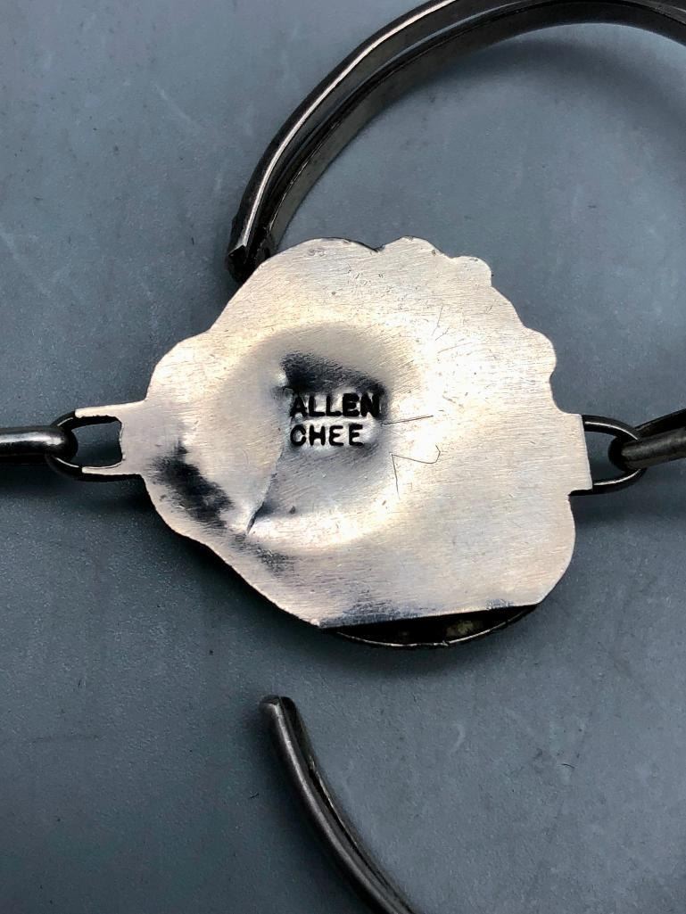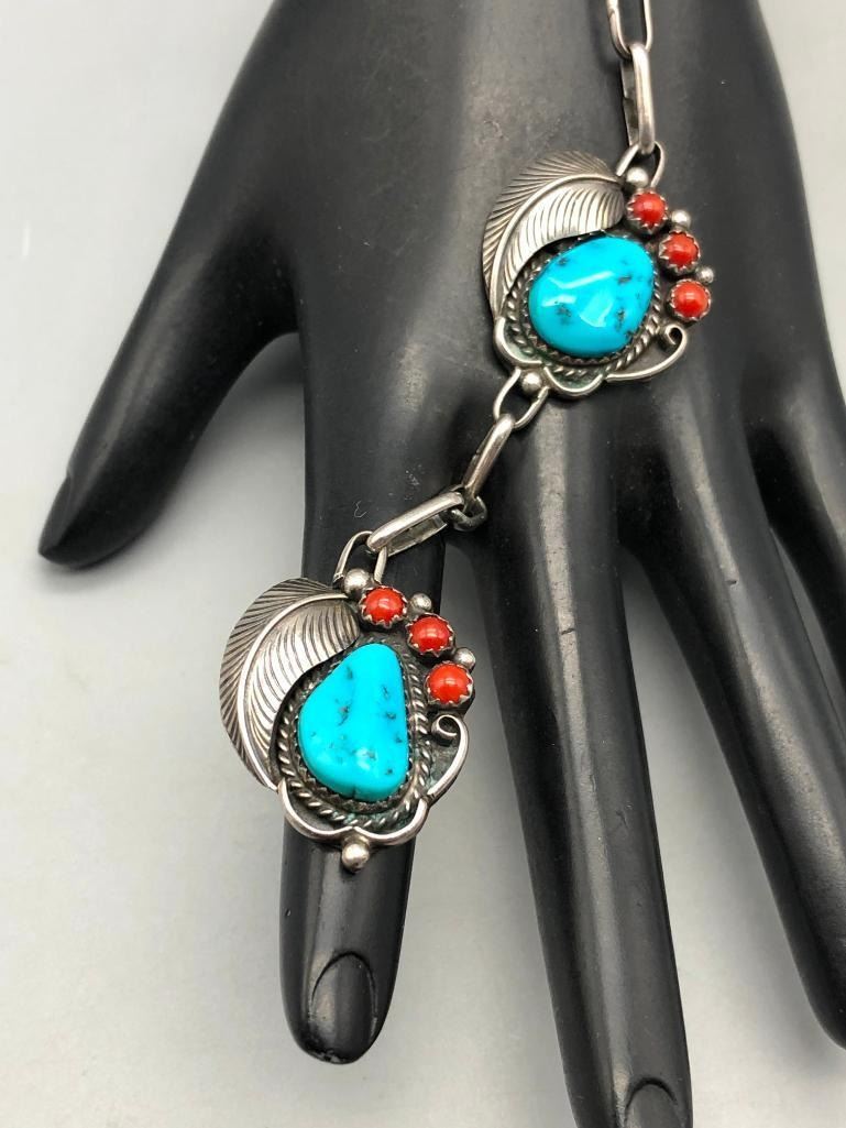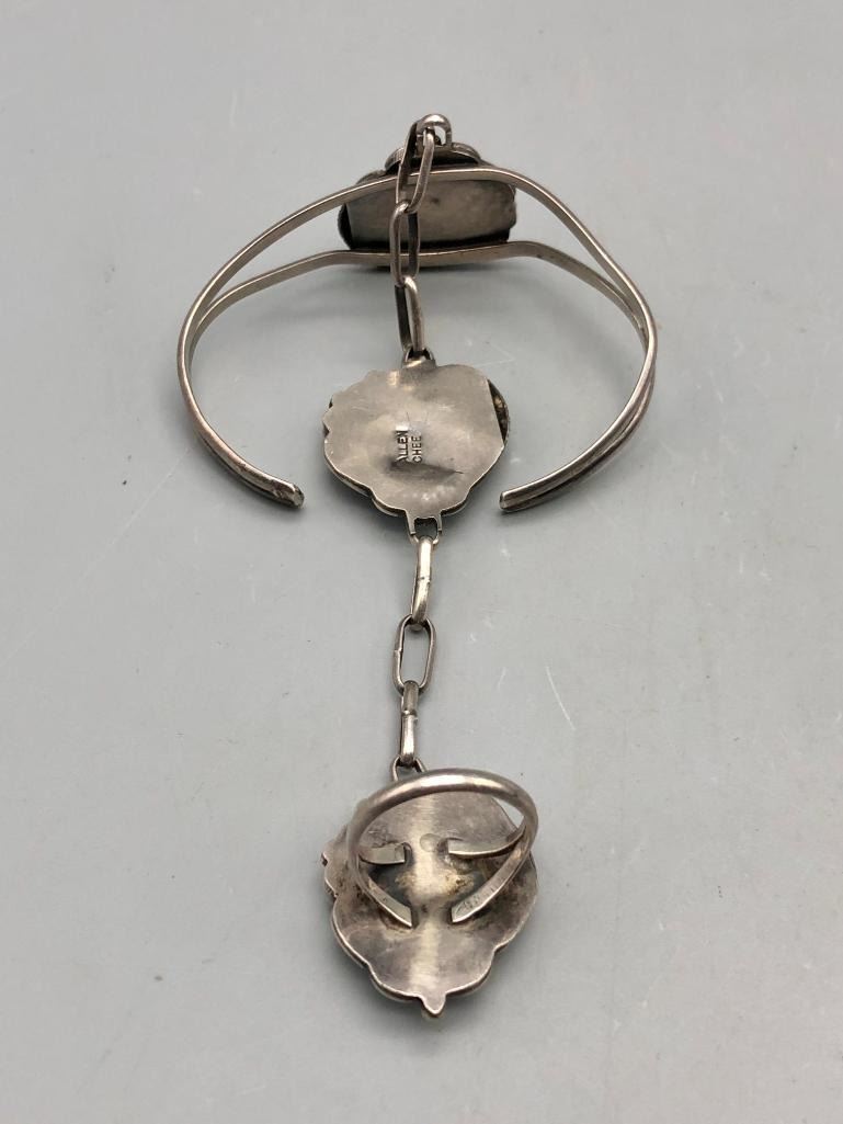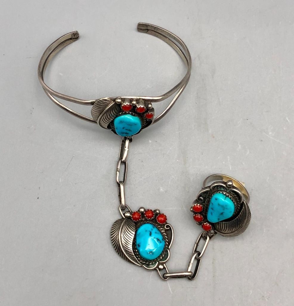 Presented for sale in this lot is a vintage three piece "slave" bracelet. This is a gorgeous bracelet set with turquoise cabochons and accented with coral dots around the bottom and silver leaf applique throughout. It is sterling silver and has an elegant look to it. MAKER/ARTIST: Hallmarked Allen Chee. (Navajo). APPROX AGE: Circa 1970s. SIZE: Inside circumference measures 5-1/4 inches long. Opening is an additional 1 inches, fitting a 6-1/4 inch wrist. Ring is a size 6.5. Weighs 27.1 grams. CONDITION: Good for its age, normal wear expected. Please look closely at the pictures as they are an important part of our description and are hereby incorporated into the description, specifically with regards to condition. SHIPPING: There will be a $5 handling / packaging fee for shipping this lot. The actual cost of postage will be added on top of that. BUY IT NOW: If you would like to buy this item now, without waiting for the auction day to bid on it, we do offer this option (which is available up to 48 hours before the actual auction starts). The “Buy it Now†price is the high estimate of this lot (plus applicable fees and the Buyer's premium is discounted to 10% when using the Buy it Now option). If you would like to exercise this option, you must contact us by email (or phone as long as you talk to someone live). Reference this lot number and your intention to "Buy it Now."