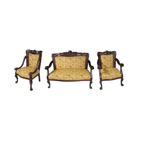 Three Piece Victorian Parlor Set includes sofa 54 X 41 X 26, mans chair 40 X 28 1/2 X 26 and womans chair 36 X 22 1/2 X 21. Walnut and new upholstery, all in excellent condition.