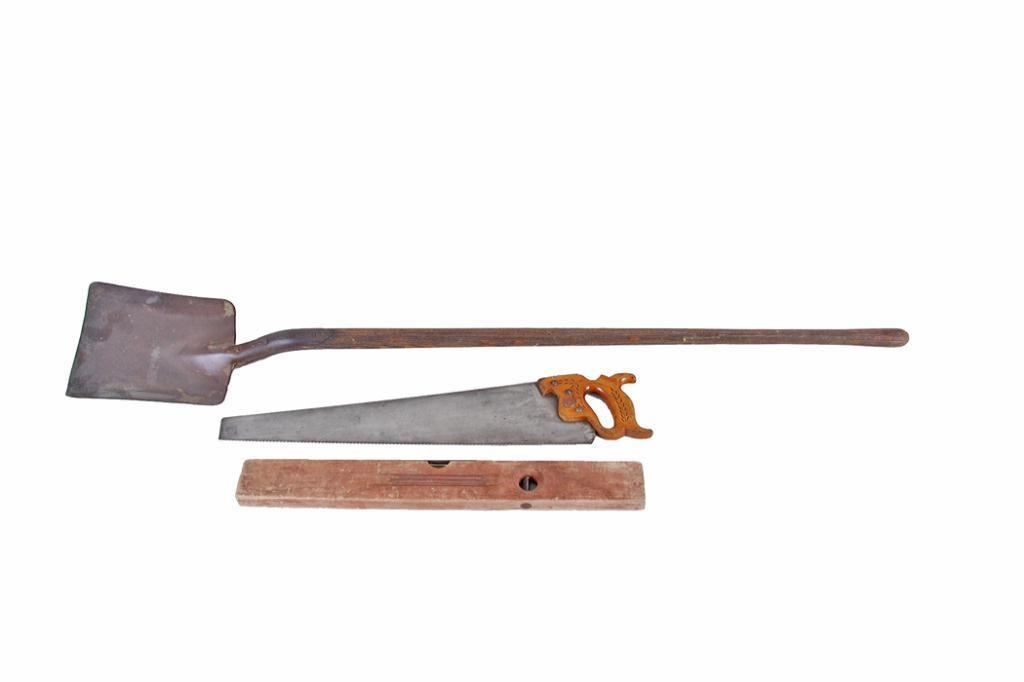 Three Piece Winchester Lot Including a hand saw, level, and a shovel.Including a hand saw, level, an