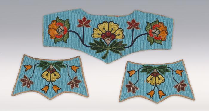 Three Pieces of Crow Beadwork for Man's Shirt. Yoke is 15" x 5 1/2". Cuffs are 8" x 4 1/2". Floral designs. Early 1900s. Condition Report: Excellent condition.