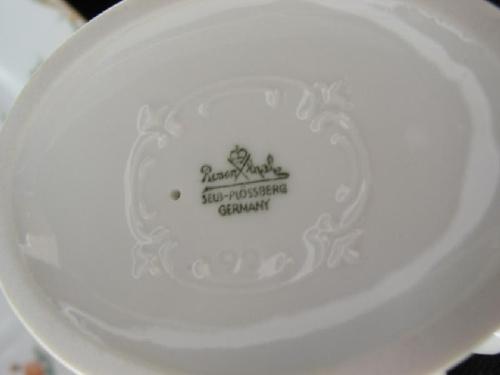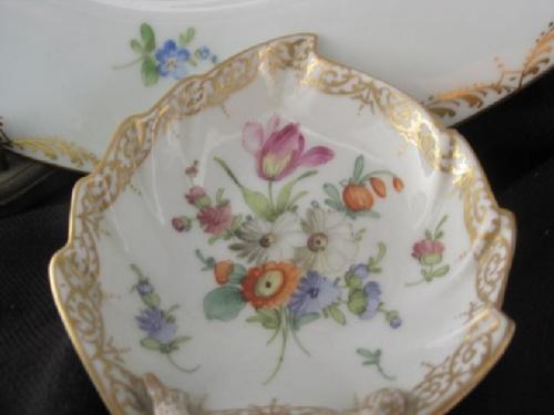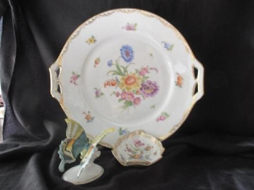 (Germany 19th Century) Large gilt and floral motif platter with handles, mark verso "Bavaria J&C Dresden", 11" by 10" Small gilt bowl with handle, mark verso "Dresden", 3" by 3 1/2" Handpainted porcelain butterfly, mark verso "Selb-Plossberg Germany" 3" by 3 1/2".