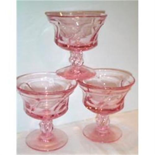 We are offering you three (3) fantastic Pink Footed Jamestown Sherbets all for one money. Each sherbet is in SUPERIOR condition with no chips, cracks, or dings and they each measure about 4" in diameter and standa bout 4.25" tall. Jamestown was manufactured by Fostoria Glass Company.