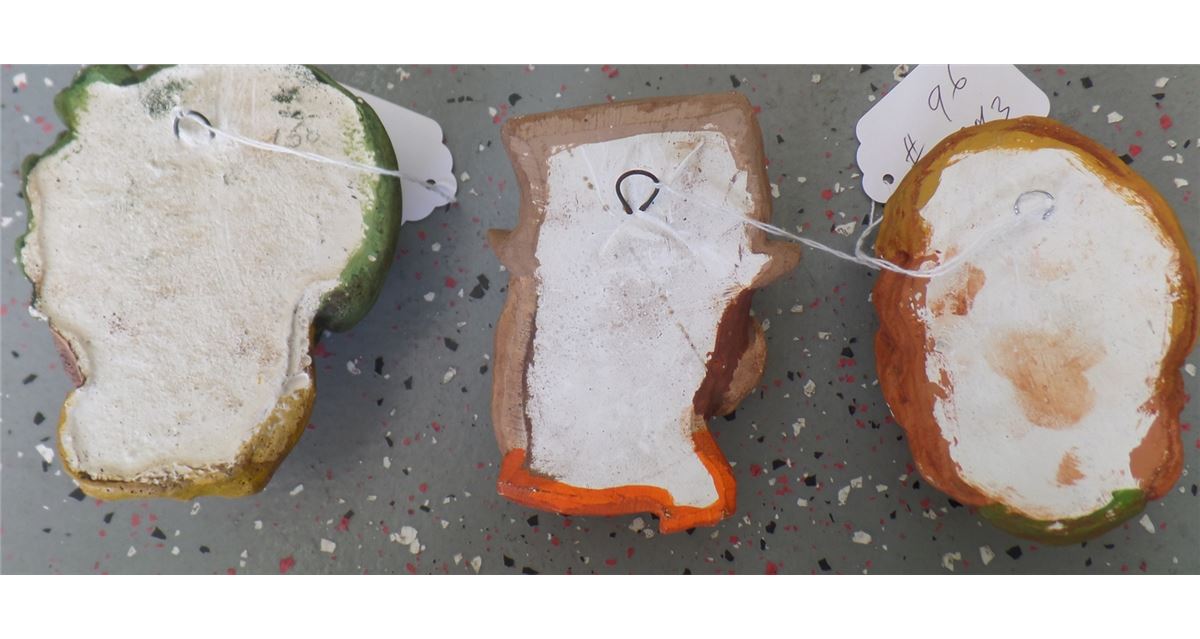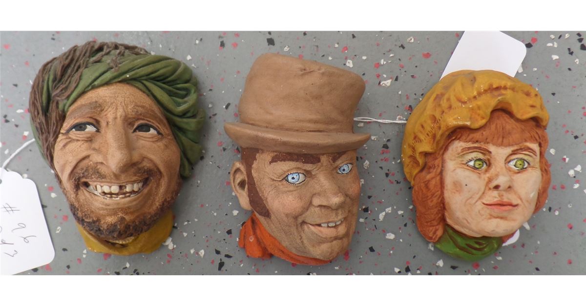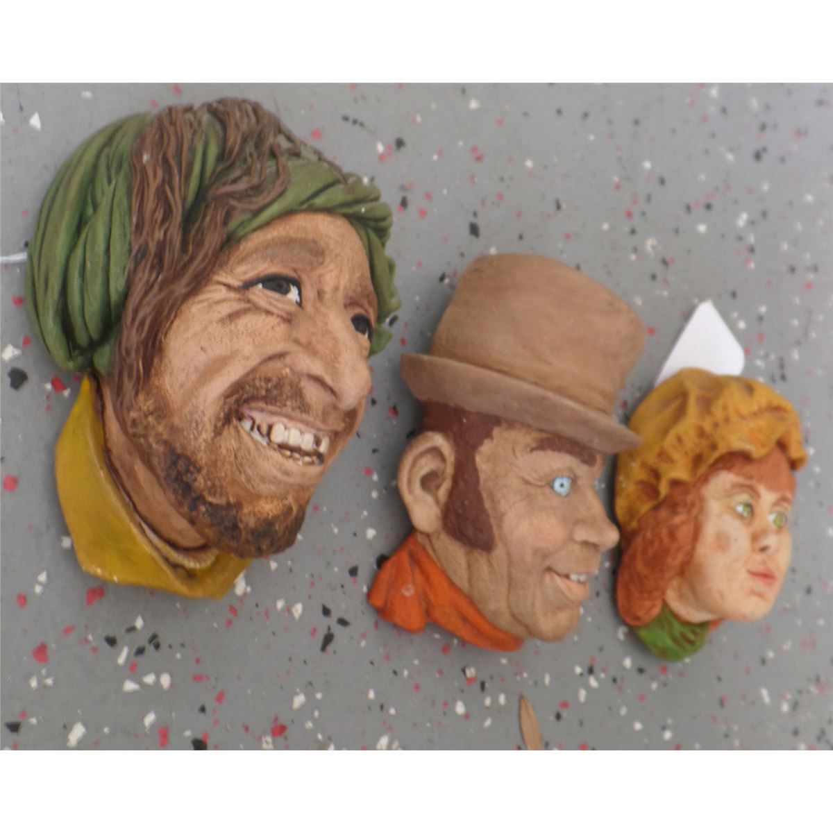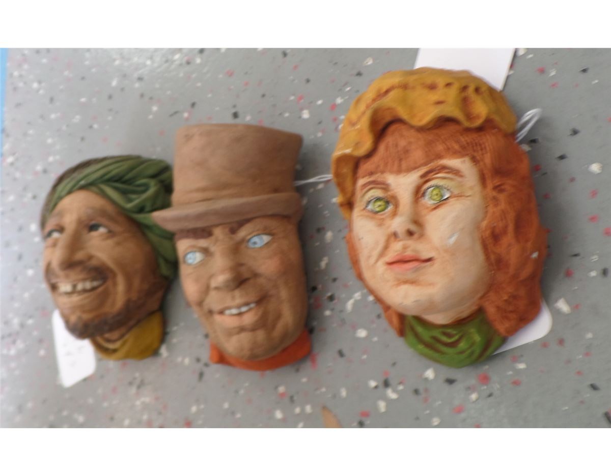 Three interesting faces made of plaster, paint ready to hang with wire hanger. These faces were probably created in the 1960's. They all measure 4x3 inches and may be "European". Shipping $18