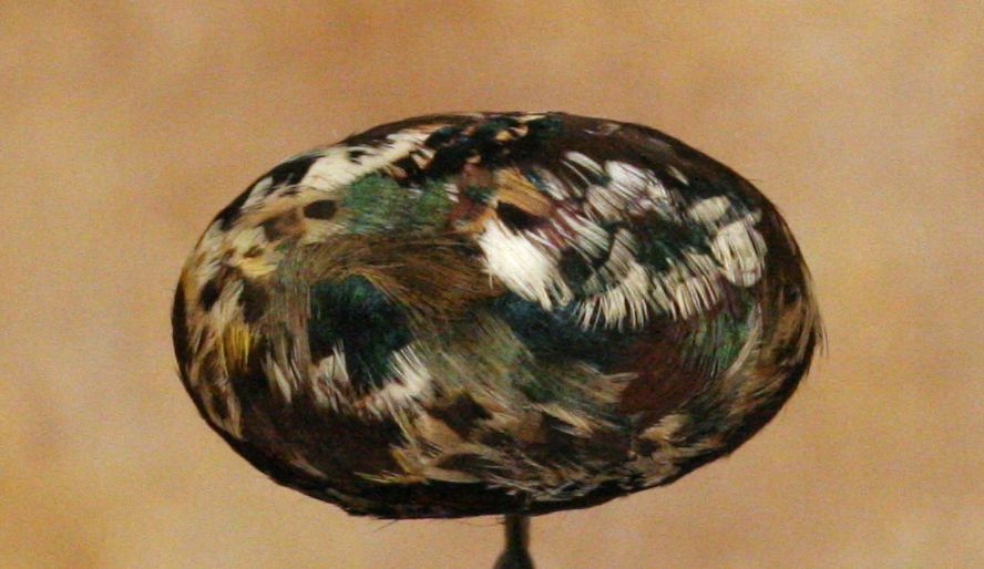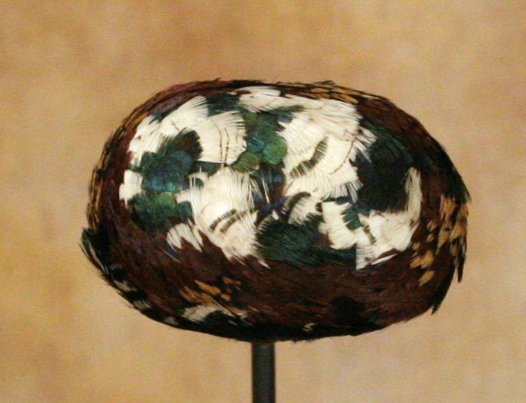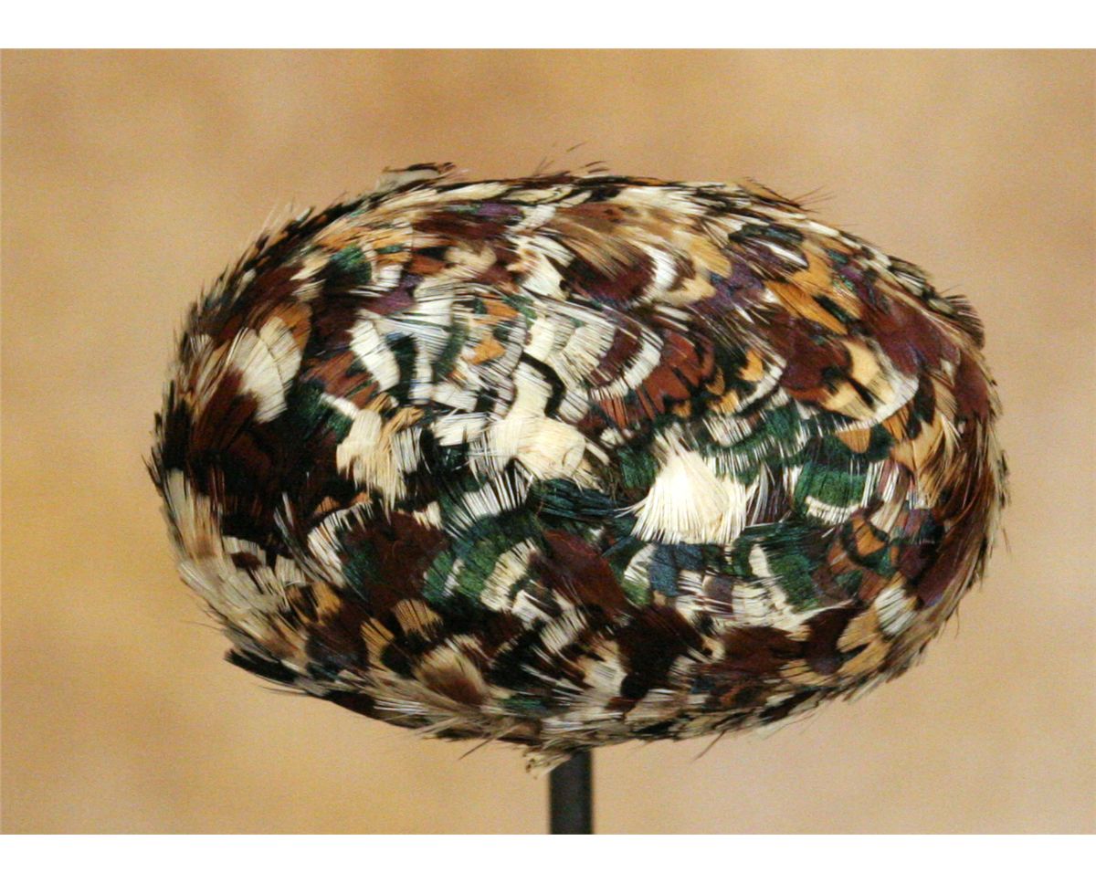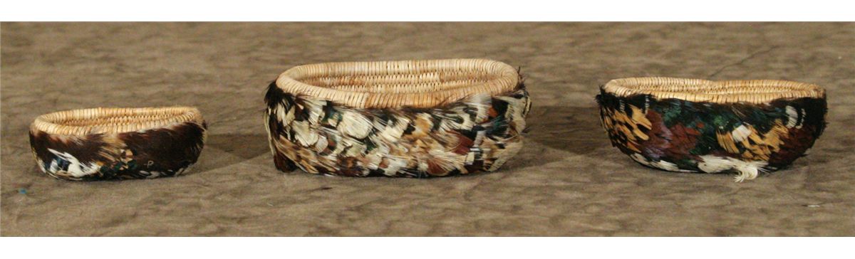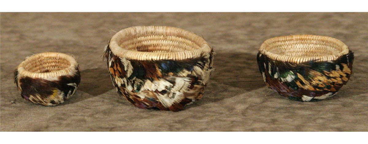 Three Pomo Feather Baskets. 1.5" tall x 3.75" long x 2.5" wide, 1.25" tall x 3.25" long x 2.25" wide and 1" tall x 2.5" long x 1.5" wide. Finely woven gift baskets covered in a variety of feathers. First half 1900s.